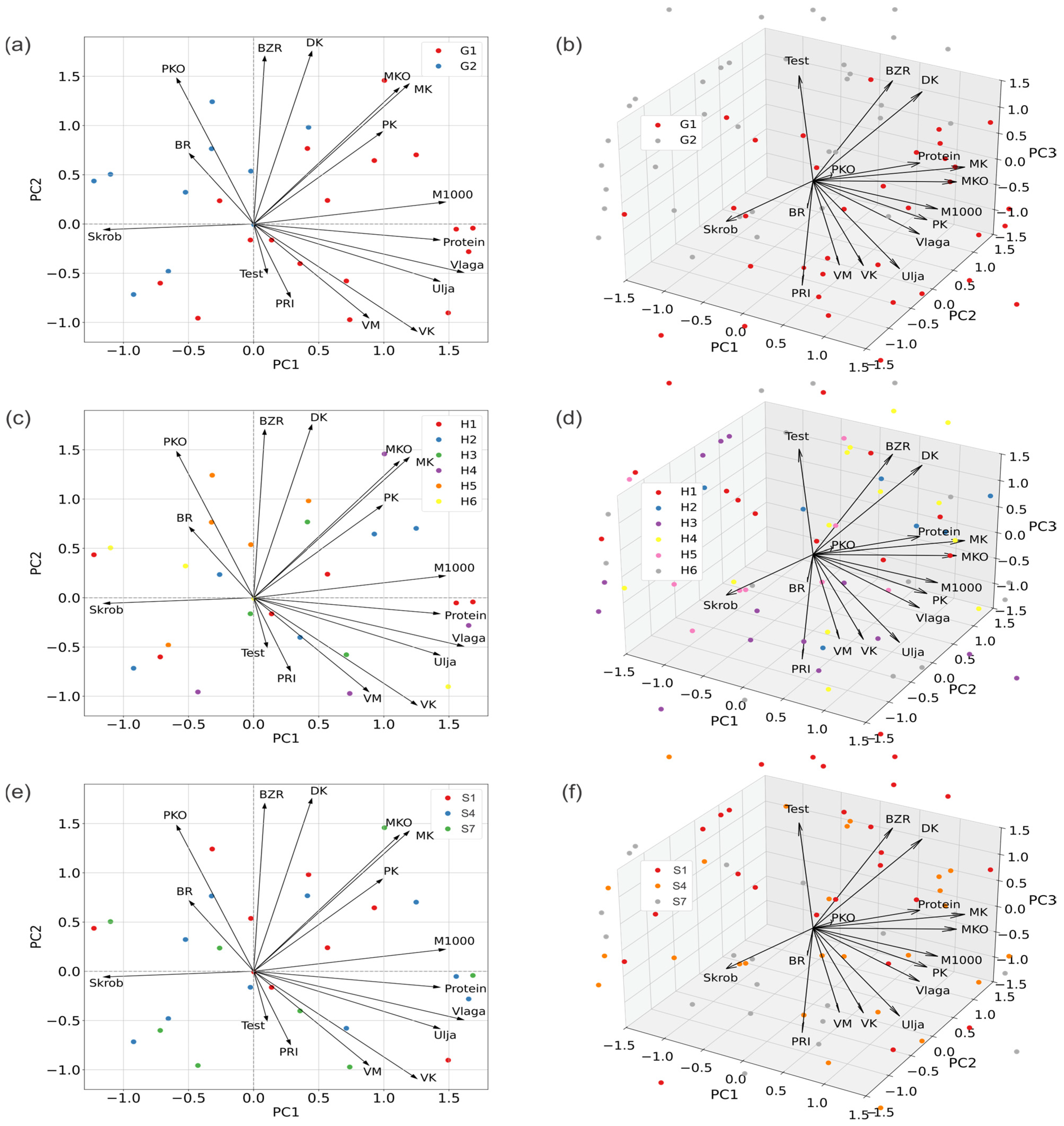 The predictive analysis for the data set “Yield, Yield component and Chemical grain parameters” was performed in relation to three predictors (G, H, S). For two parameters (moisture and oil), models of high accuracy and reliability (80%) were obtained, while the parameter protein achieved an accuracy limit of 50% (