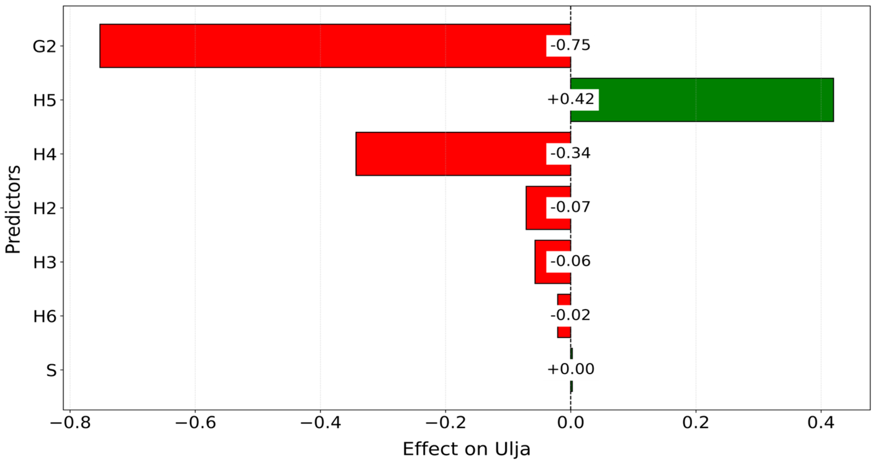 Same as for Vlaga, we are referring to the final regression equation for Ulja, providing an interpretable representation of the contribution of each predictor (Equation (7)).