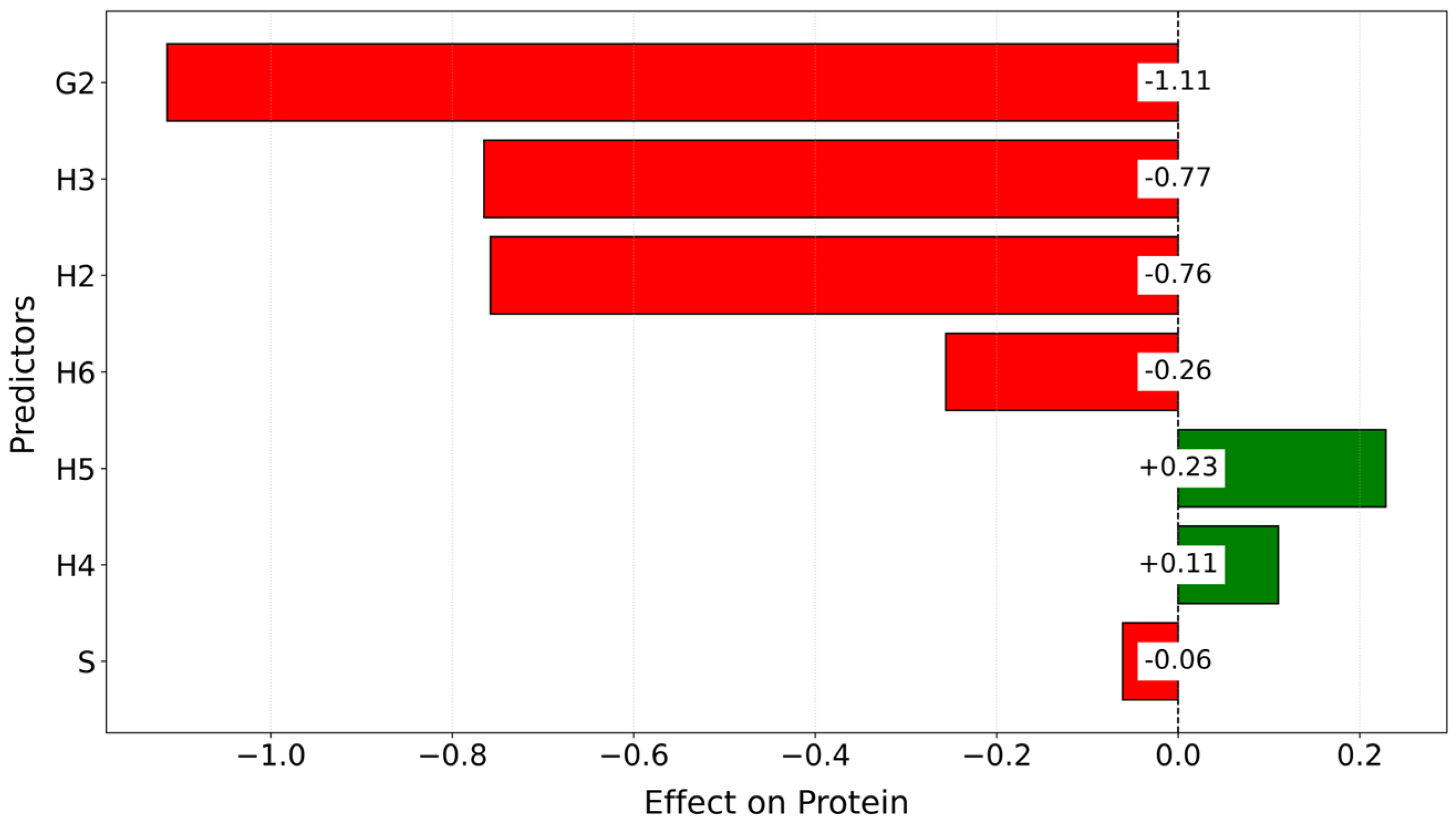 The linear regression model created for analysing protein levels with the predictors G, S, and H yielded an R