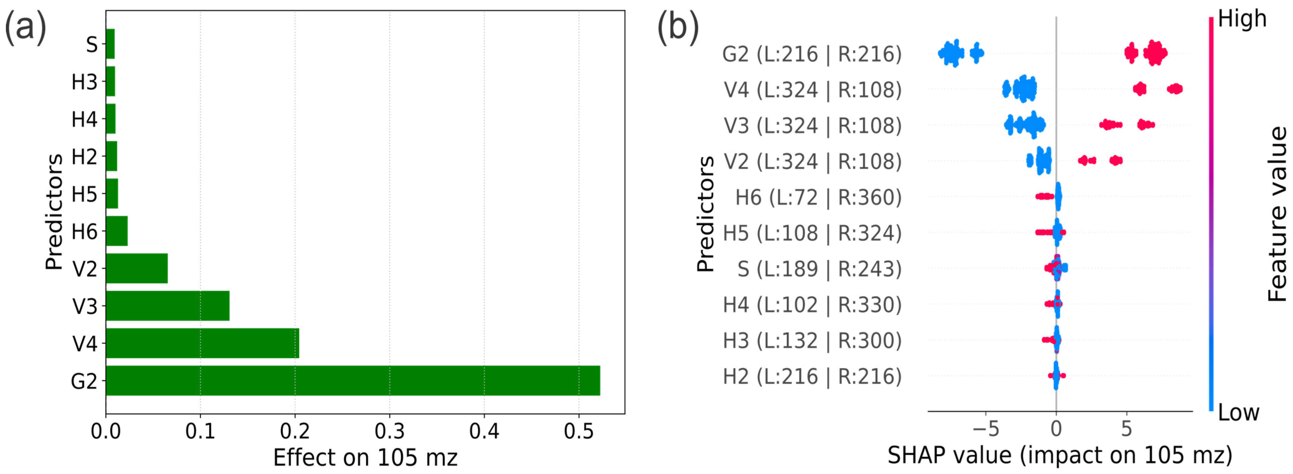 Figure 9b), the presence of predictor G2 has evidently resulted in an increase of the 105 mz parameter. The SHAP values associated with G2 were consistently positive, ranging from approximately +5 to +7.5, which signified a reliable positive influence of the second year on the variable 105 mz. Predictors V4, V3, and to a lesser extent V2, exhibited a trend towards increasing the value at 105 mz, with V4 making the most significant contribution, characterized by its notably positive SHAP values. V4 expressed a pre-dominantly positive effect, while V3 offered a moderate positive contribution. On the other hand, V2 had a weak impact. In contrast, the factors H and S showed a variable influence, with some leading to an increase in a on the one hand, and a decrease in the value to 105 mz on the other hand. Additionally, predictor S played a dual role, contributing to both the increase and decrease of the 105 mz parameter.