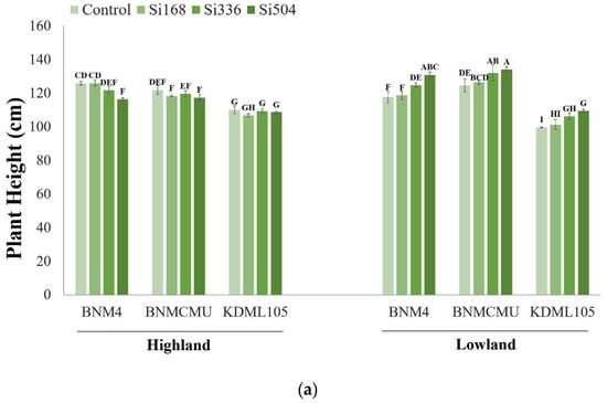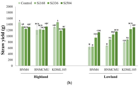 Effects of silicon (Si) application on plant height (a), number of tillers per plant (b), number of panicles per plant (c), grain filling percentage (d), grain unfilled percentage (e), 1000-grain weight (f), grain yield (g), and straw yield (h) in three Thai fragrant rice genotypes grown under highland and lowland conditions. Plants were subjected to four Si application rates: 0 (Control), 168, 336, and 504 kg Si ha−1. Different letters above bars indicate significant differences according to the least significant difference (LSD) test at p < 0.05.
