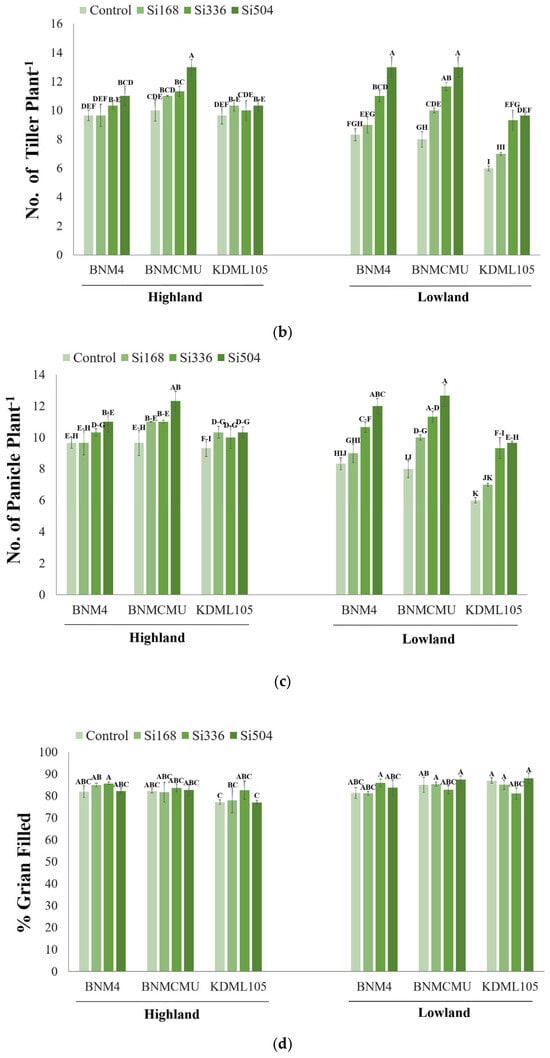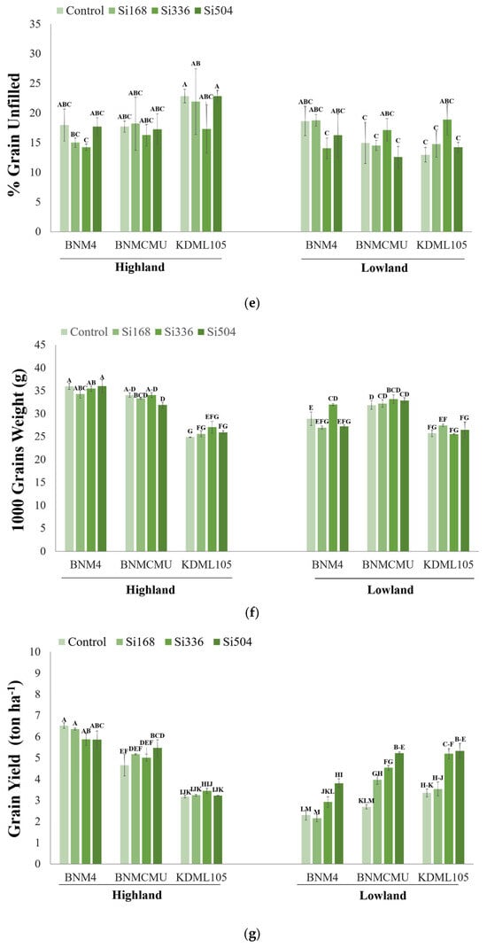 Silicon application also positively affected several yield components, including tiller number, panicle number, and straw yield, particularly in the lowland site. Most genotypes exhibited the strongest responses at 336 kg Si ha−1. In the highland, only BNMCMU showed a significant increase in tiller number at 504 kg Si ha−1 (Figure 1b,c,h). Plant height increased significantly with Si application at 504 kg Si ha−1 in the lowland across all genotypes, but no such effect was observed in the highland. Other yield traits, including 1000-grain weight and grain-filled/unfilled percentages, were generally unresponsive to Si. However, in the lowland, BNM4 exhibited a 10.7% increase in 1000-grain weight at 336 kg Si ha−1 compared to the control.