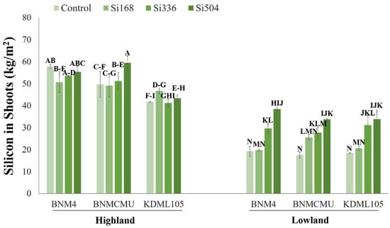 Silicon (Si) content in shoot tissues of three Thai fragrant rice genotypes grown under highland and lowland conditions and subjected to four levels of Si application: 0 (Control), 168, 336, and 504 kg Si ha−1. Different letters above the bars indicate significant differences according to the least significant difference (LSD) test at p < 0.05.