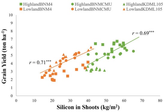 Relationships between grain yield and silicon (Si) content in the shoots of three Thai fragrant rice genotypes grown under highland and lowland conditions with four levels of Si application: 0 (Control), 168, 336, and 504 kg Si ha−1 (*** indicate significant difference at p < 0.001).