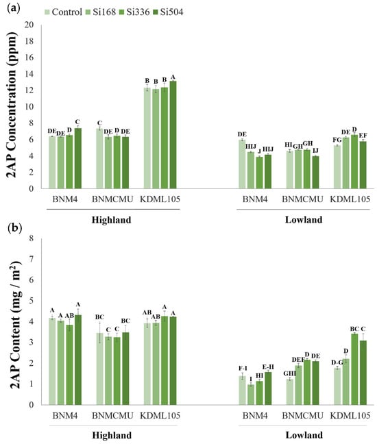 Concentration (a) and content (b) of 2-acetyl-1-pyrroline (2AP) in three Thai fragrant rice genotypes grown under highland and lowland conditions with four levels of silicon (Si) application: 0 (Control), 168, 336, and 504 kg Si ha−1. Different letters above bars indicate significant differences according to the least significant difference (LSD) test at p < 0.05.