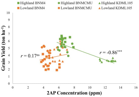 Relationships between grain yield and 2-acetyl-1-pyrroline (2AP) concentration in three Thai fragrant rice genotypes grown under highland and lowland conditions with four levels of silicon (Si) application: 0 (Control), 168, 336, and 504 kg Si ha−1 (*** indicate significant difference at p < 0.001, and ns indicate no significant difference).