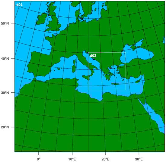 Two nested domains, coarse (d01), with a horizontal resolution of 50 km, and fine (d02), with a horizontal resolution of 10 km, were set (Figure 1). D02 focuses on the broader area of Greece in order to better capture the fine-scale climate features and the complex topography of the region. The 10 km grid used in this study represents an optimal compromise between sufficient physical and spatial representation and feasible computational demands. Both domains have the same vertical extent and resolution, ranging from the surface up to 100 hPa and represented through 35 unevenly spaced vertical levels.