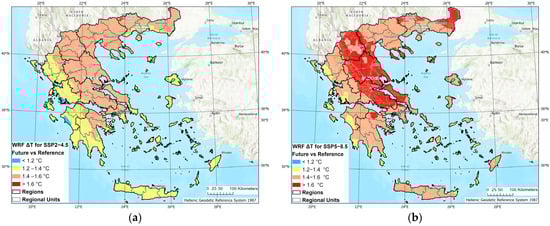 The projected difference (future vs. reference period) in mean temperature (ΔΤ) (°C) at 2 m for each model grid cell under the SSP2-4.5 (a) and SSP5-8.5 (b) emission scenarios across Greece.