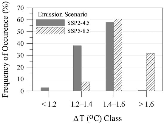 The mean ΔΤ projections are presented in Figure 2. For the intermediate emission scenario (SSP2-4.5), the mean T is projected to increase by 1.2–1.4 °C in the area that covers Western Greece, Crete, and the Ionian and Aegean islands, while a higher increase, namely 1.4–1.6 °C, is projected for almost the rest of the country (Figure 2a). These regions correspond to 38% and 58%, respectively, of the country’s territory (Figure 3). For the worst-case emission scenario (SSP5-8.5), a clear shift to higher ΔΤ classes is projected (Figure 3). Mean T increases higher than 1.6 °C are projected for central Greece (Figure 2b), corresponding to an area that accounts for 32% of Greek territory (Figure 3). Increases by 1.4–1.6 °C are projected for almost the rest of the country (Figure 2b), corresponding to 61% of Greek territory (Figure 3).