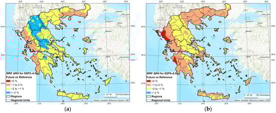 The projected difference (future vs. reference period) in the mean relative humidity (ΔRH) (%) at 2 m for each model grid cell under the SSP2-4.5 (a) and SSP5-8.5 (b) emission scenarios across Greece.