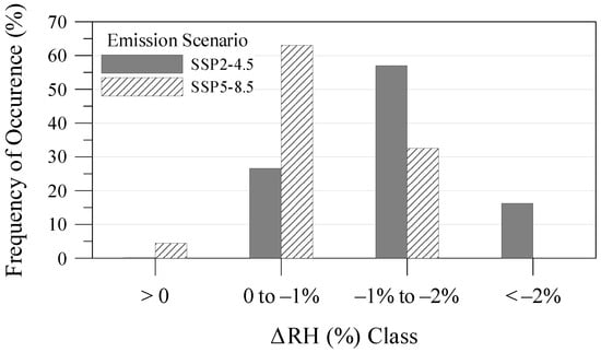 The mean ΔRH projections are presented in Figure 4. For the intermediate emission scenario (SSP2-4.5), the mean RH is projected to decrease by up to −1% in the area that covers Western Greece, the greater part of Thrace, and the Northern Aegean islands; more than −2% in the area that covers Western Macedonia and the mountainous areas of central Greece; and by −1% to −2% in the rest of the country (Figure 4a). These regions correspond to 27%, 16%, and 57%, respectively, of the country’s territory (Figure 5). For the worst-case emission scenario (SSP5-8.5), a clear shift to lower ΔRH classes is projected (Figure 5). The mean RH is projected to decrease by up to −1% and by −1% to −2% in areas that correspond to 63% and 33%, respectively, of the country’s territory, while the mean RH is projected to mildly increase in small parts of the west (Figure 4b and Figure 5). This result is somewhat counter-intuitive, as the stronger warming under SSP5-8.5 would, in principle, suggest a greater decrease in relative humidity, given that warmer air can hold more moisture, even if the absolute atmospheric water content remains constant. However, this thermodynamic effect may be offset by increased evaporation over the Mediterranean due to elevated temperatures []. In addition, changes in regional circulation patterns could influence future RH values by affecting moisture transport [], as well as orographic convection and precipitation, in the west and the Pindos mountain range, where the differences between the two scenarios are most pronounced. Hence, these findings reflect the complex interaction between thermodynamic and dynamic processes in determining future relative humidity patterns.