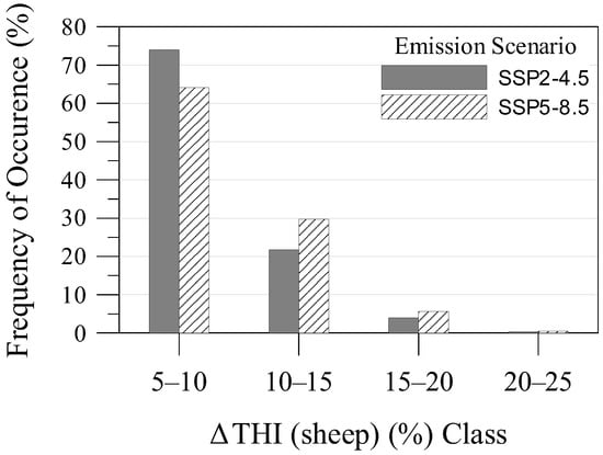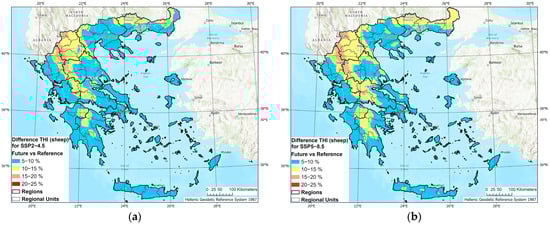 The mean ΔΤHI (sheep) projections are presented in Figure 6. For the intermediate emission scenario (SSP2-4.5), the mean THI (sheep) is projected to increase by 5–10% in most of the country’s regions (Figure 6a), specifically in 74% of Greek territory (Figure 7). The mean THI (sheep) levels became slightly worse when the worst-case emission scenario (SSP5-8.5) was applied (Figure 6b and Figure 7). Higher increases are projected for mountainous areas for both emission scenarios (Figure 6).
