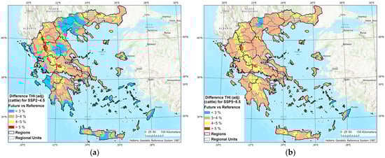 The mean ΔΤHI (adj) (cattle) projections are presented in Figure 8. For the intermediate emission scenario (SSP2-4.5), the mean THI (adj) (cattle) is projected to increase by 3–4% and less than 3% (Figure 8a) in 52% and 30% of Greek territory, respectively (Figure 9). The mean THI (adj) (cattle) shifted to higher values when the worst-case emission scenario (SSP5-8.5) was applied (Figure 8b and Figure 9). As for sheep, higher increases are projected for mountainous areas for both emission scenarios (Figure 8).