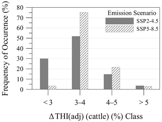 Frequency of occurrence (%) of the number of model grid cells exhibiting each THI (adj) (cattle) difference [ΔΤHI (adj) (cattle)] (%) class presented in Figure 8.