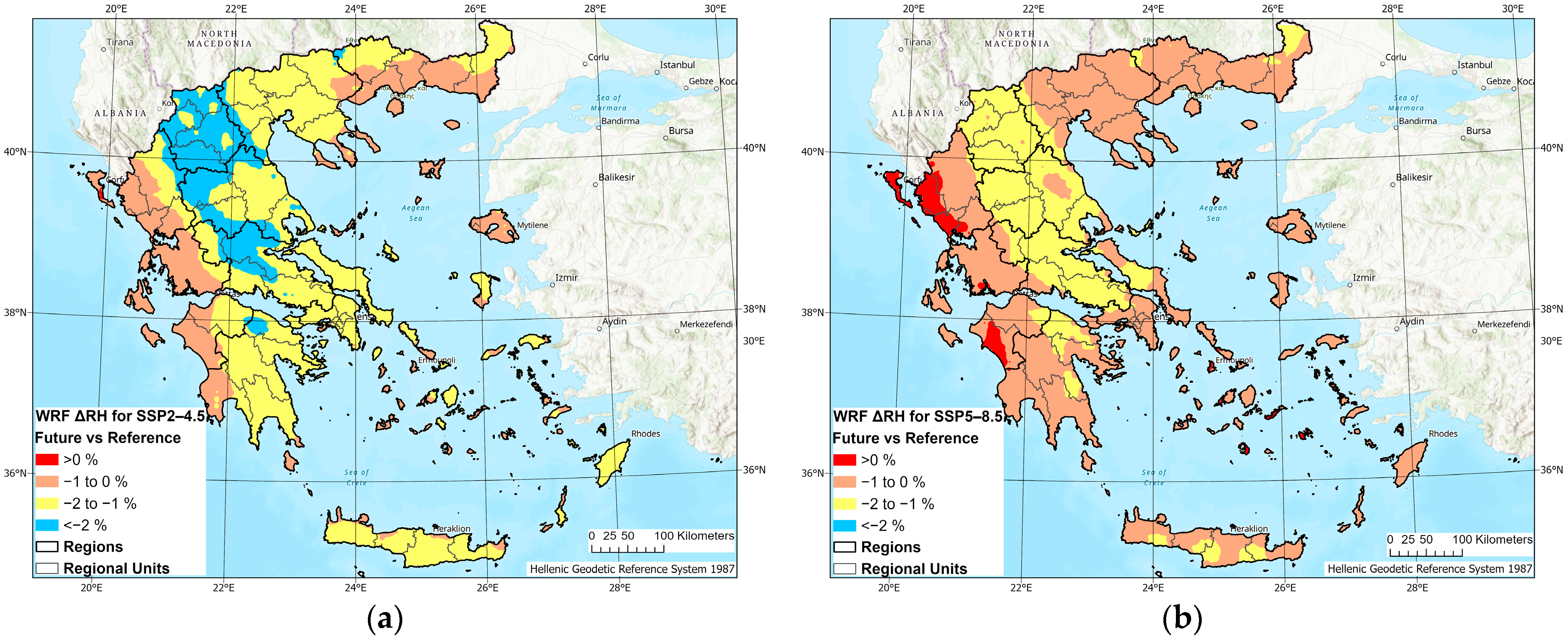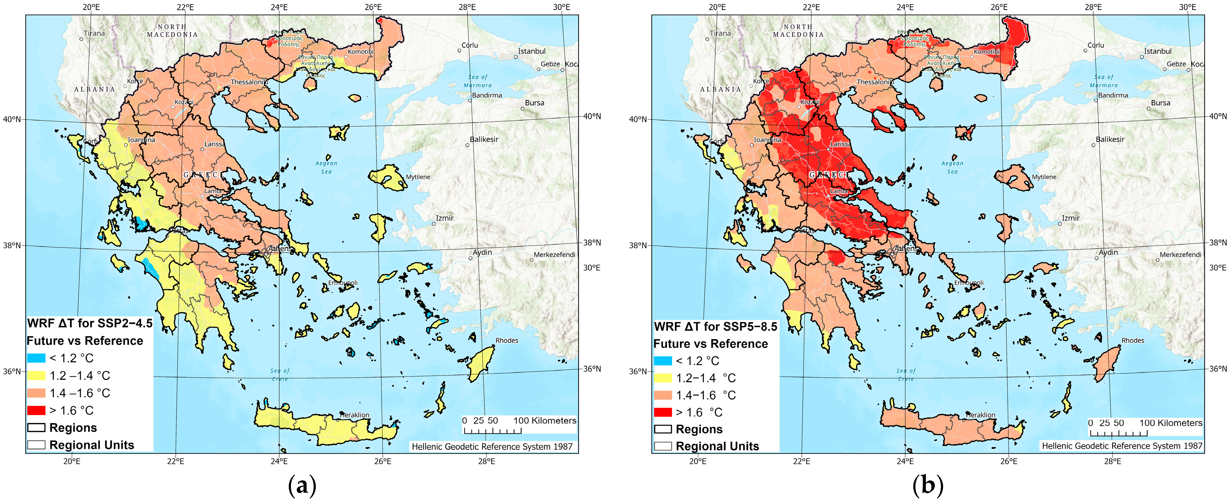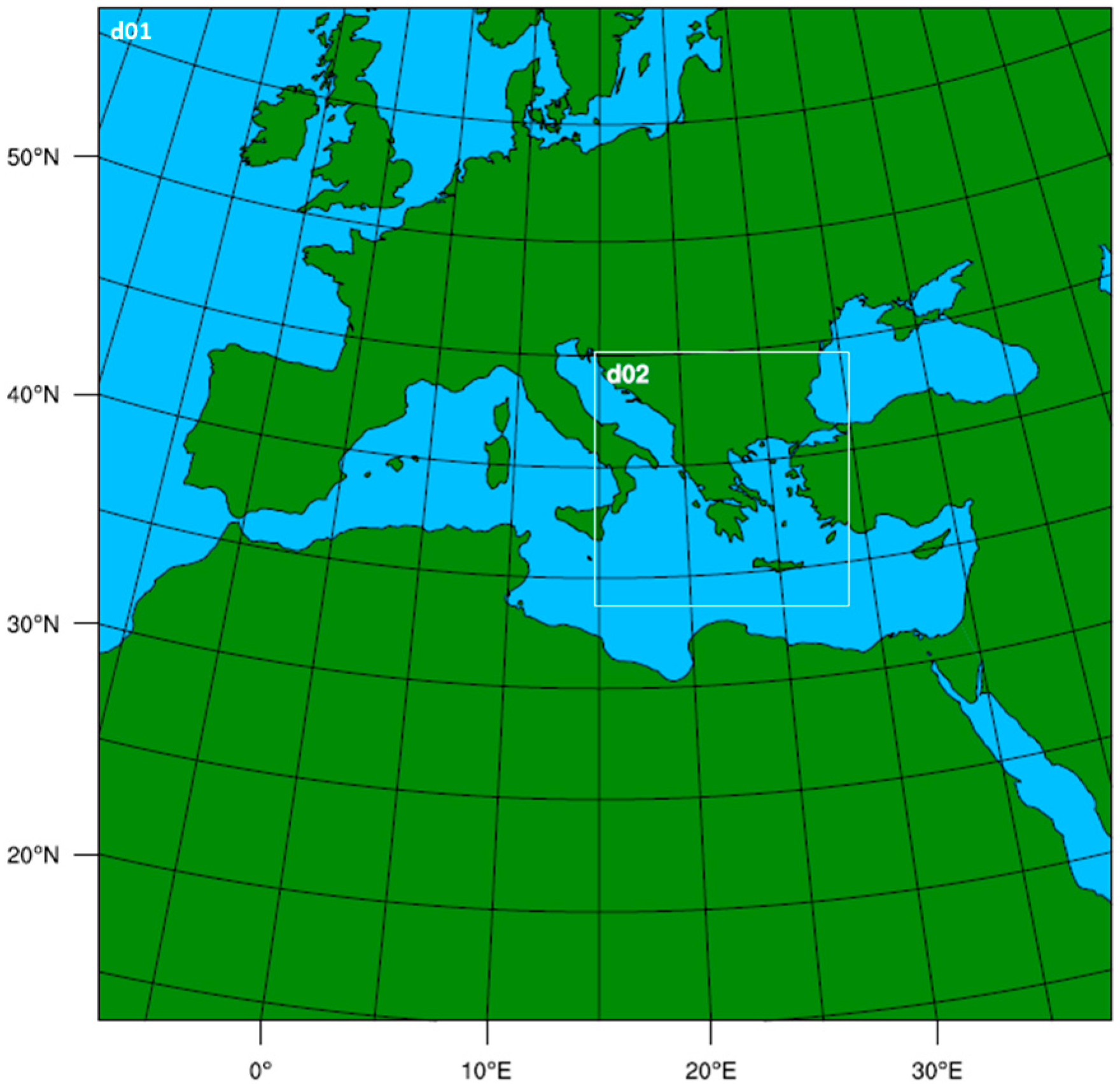 - Politi, N.; Nastos, P.T.; Sfetsos, A.; Vlachogiannis, D.; Dalezios, N.R. Evaluation of the AWR-WRF model configuration at high resolution over the domain of Greece. Atmos. Res. 2018, 208, 229–245. [Google Scholar] [CrossRef]