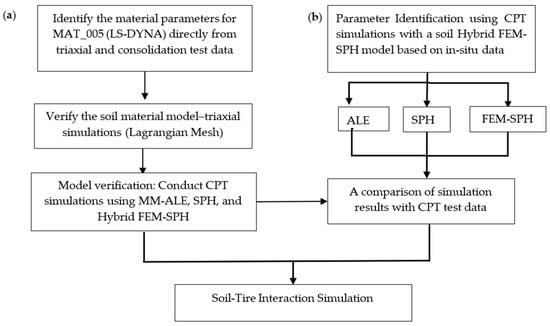 Overall, the optimized MAT_005 model combined with SPH and Hybrid FEM–SPH methods demonstrated predictive capabilities comparable to the CP model for granular soils while maintaining compatibility with LS-DYNA’s advanced numerical frameworks. These results validate the integration between field-calibrated parameter identification and meshless methods for accurate, computationally efficient modeling of soil compaction under agricultural traffic. Future research should aim to integrate strain softening into the MAT_005 formulation, extend the methodology to other soil types (including cohesive clays and partially frozen soils), explore moisture-dependent parameterization, and employ high-resolution CPT equipment for capturing continuous penetration resistance profiles. Such developments would expand the applicability of this workflow in precision agriculture, enabling improved design of low-compaction machinery and more sustainable soil management practices [