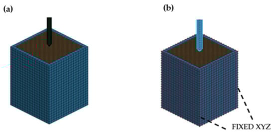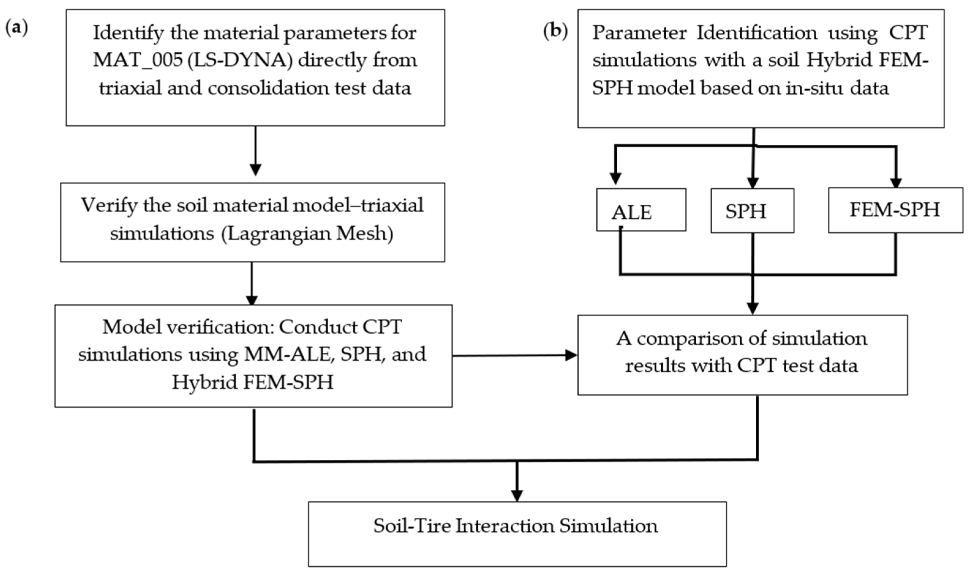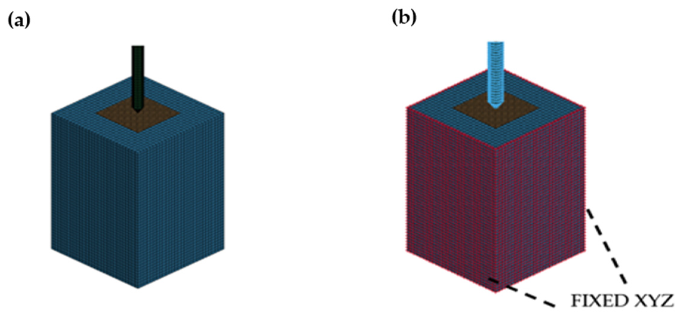 6] typically offers higher computational efficiency (e.g., shorter runtimes due to reduced computational volume) but struggles with granular behavior, yielding 20% errors in CPT simulations. In contrast, SPH in LS-Dyna provides superior accuracy (2–5% error) for granular soils but is computationally intensive (e.g., 22 h and high memory for 350,000 particles in our CPT simulation). The Multi-Material Arbitrary Lagrangian–Eulerian (MM-ALE) method takes less computational time (e.g., 16 h with 300,000 elements), while Hybrid-SPH balances accuracy and efficiency, completing simulations by combining SPH and Lagrangian elements [