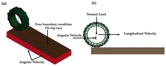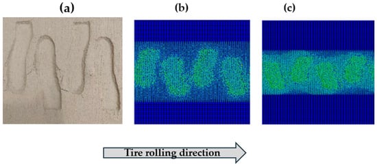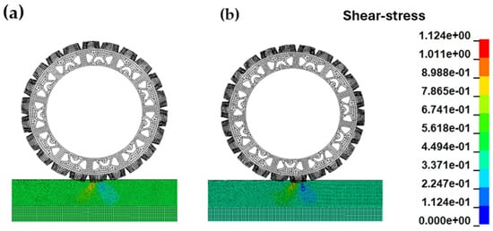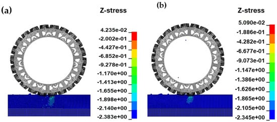 Figure 22) further revealed that Soil-B’s contours aligned more closely with the experimentally observed slip plane, with a more realistic distribution of tensile stresses in front of the tire and compressive stress behind it, improving the prediction of traction efficiency and energy loss during field operations [