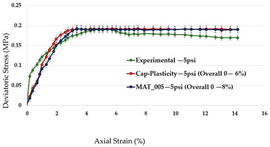 Section 3.1.2), where peak deviator stress was slightly underpredicted compared to both experimental data and the Cap Plasticity (CP) model results [