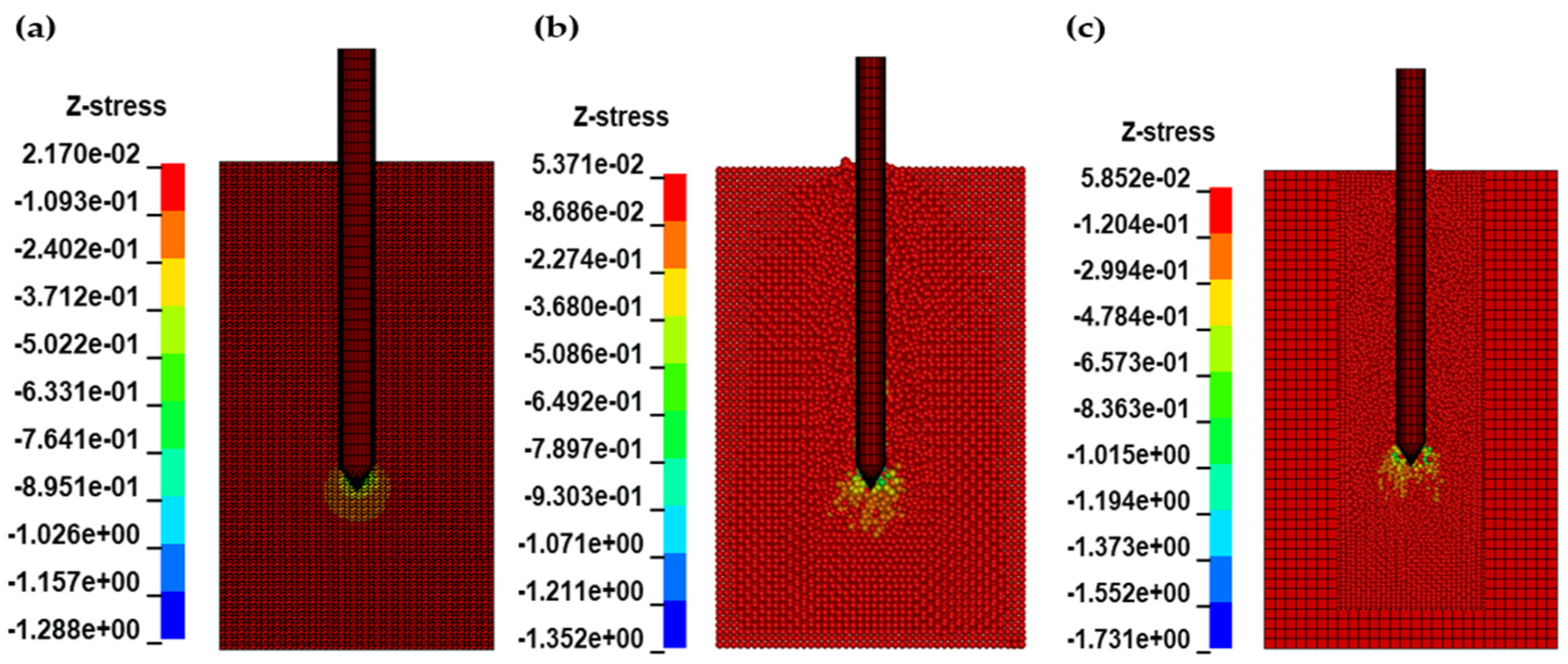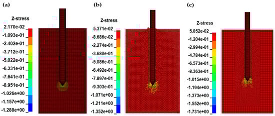 47]. In contrast, MM-ALE produced more diffuse stress and strain patterns, which may explain its tendency to overpredict cone resistance at deeper penetrations. These results underscore the importance of selecting numerical methods that align with the physical characteristics of the target soil and the scale of deformation being modeled.