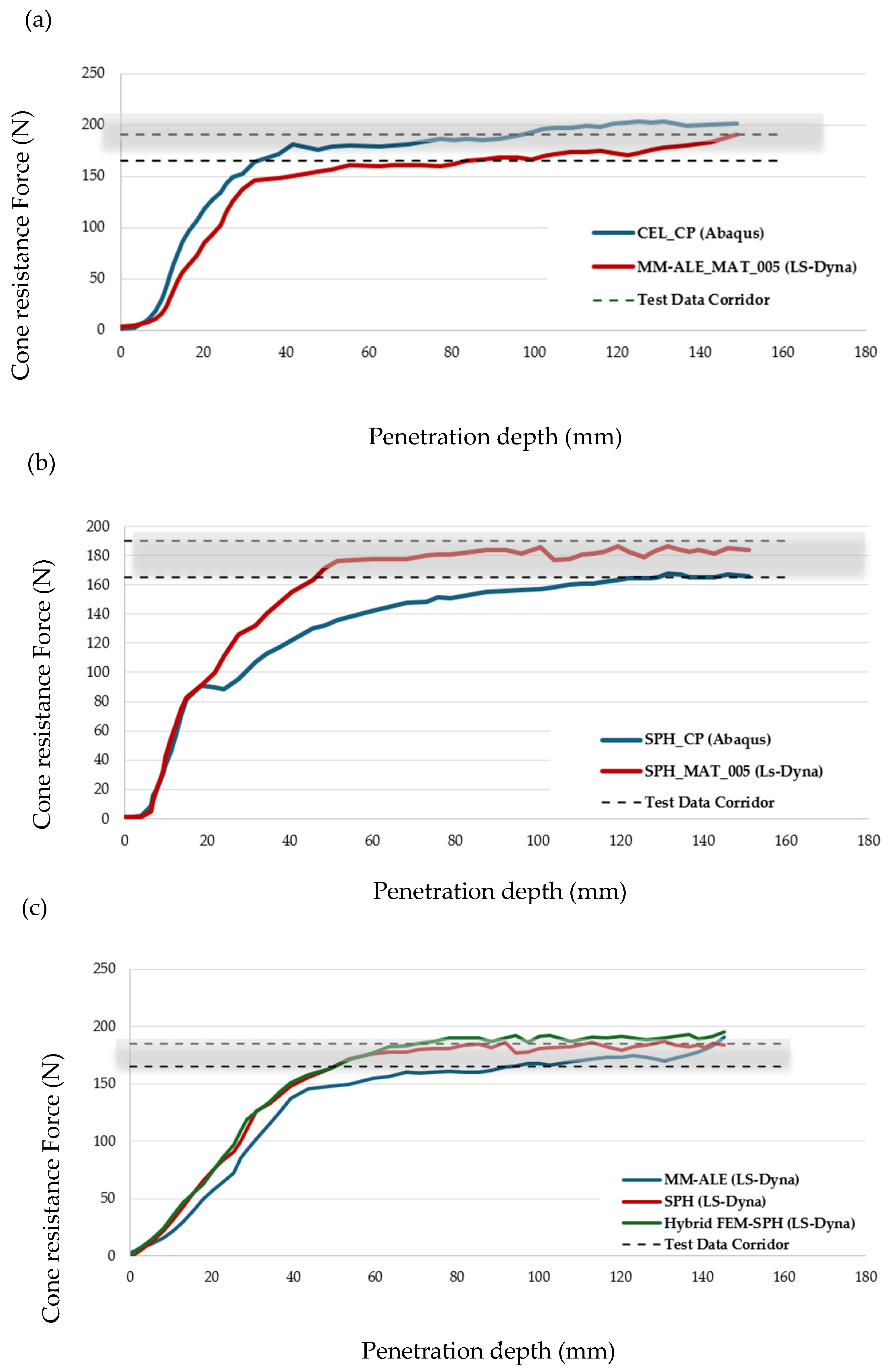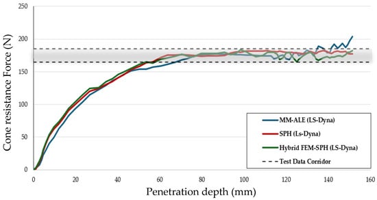 Final CPT simulations were conducted with the optimized MAT_005 parameters using MM—ALE, SPH, and Hybrid FEM—SPH methods. Force penetration curves for all three methods using optimized parameters align with the experimental corridor across the 150 mm penetration depth (