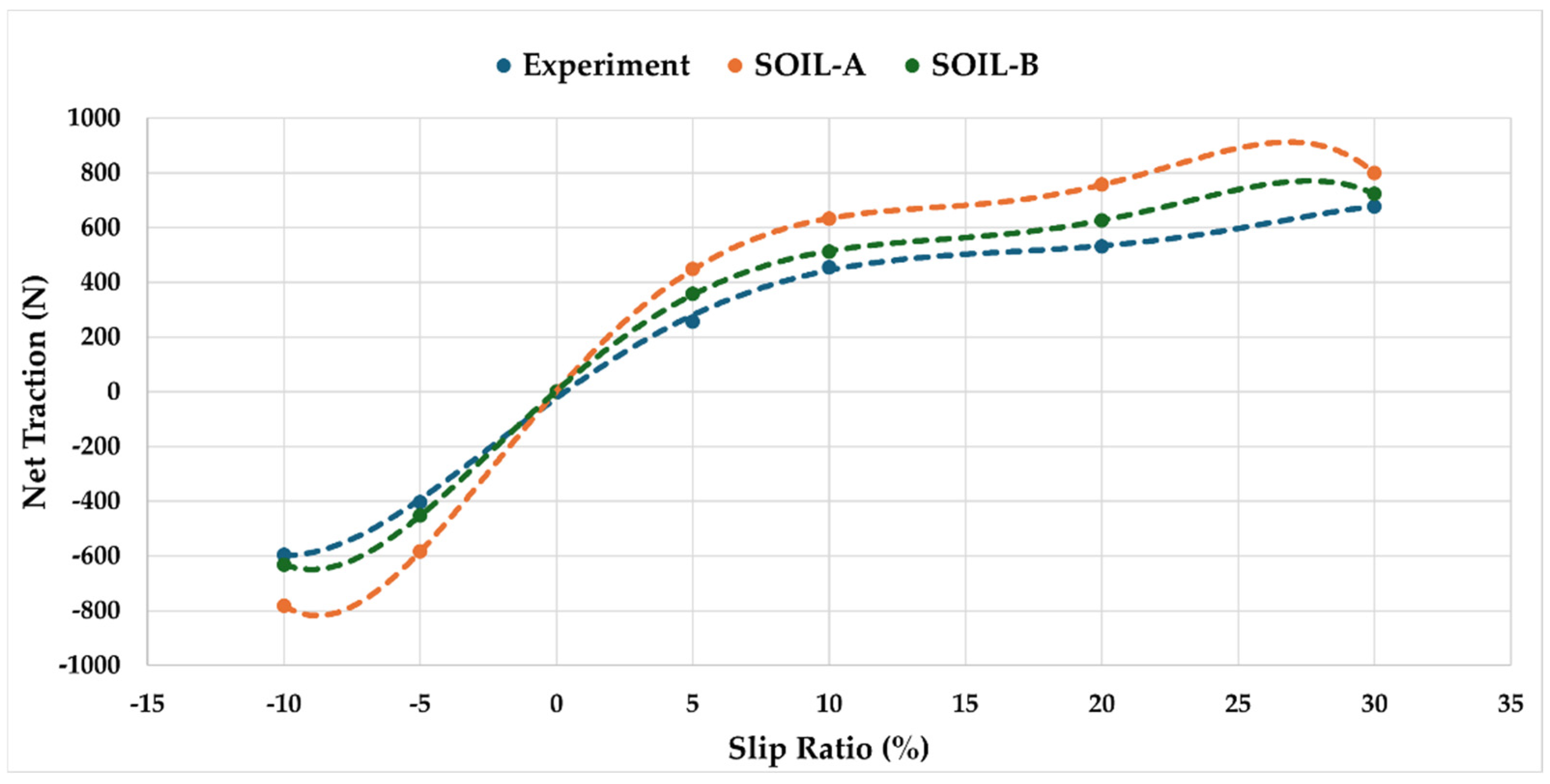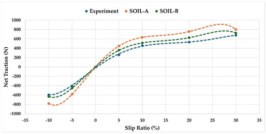 Figure 19. The experimental data demonstrate traction increasing from −600 N at −10% slip to approximately 800 N at 30% slip. Soil-A consistently underpredicts traction, reaching 800 N at 30% slip, while Soil-B closely follows the experimental curve, predicting ~724 N at the same slip level.