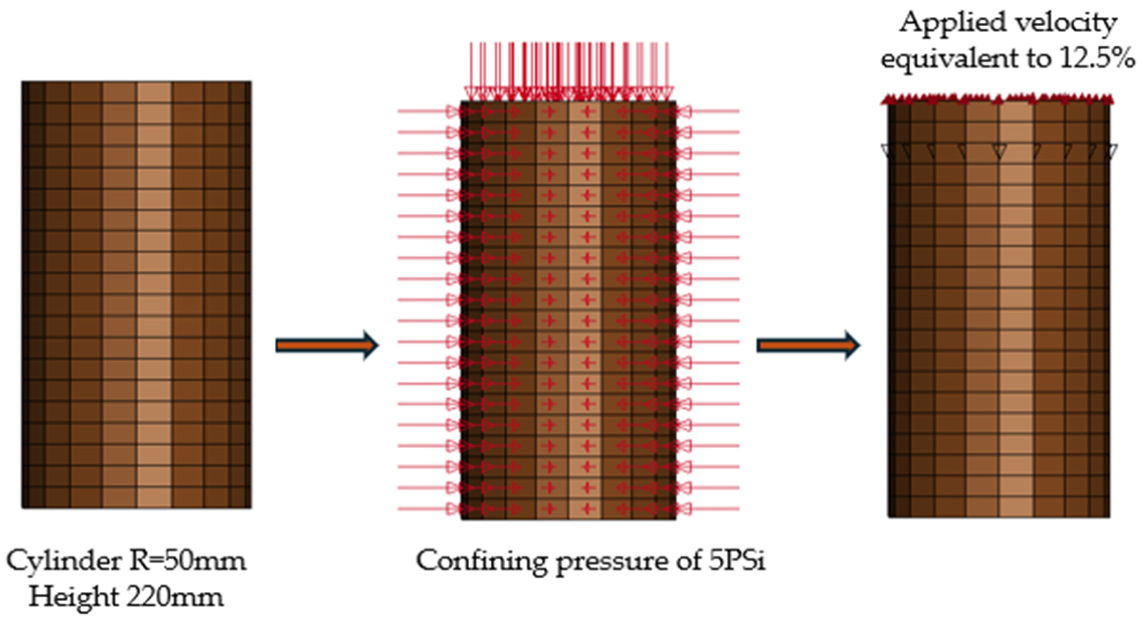 Section 3.1 outlined, the laboratory approach relied on triaxial and consolidation tests to determine key parameters such as cohesion, friction angle, shear modulus, bulk modulus, and volumetric strain–pressure relationships. These experimentally derived values provided a solid baseline for initial simulations, capturing fundamental soil mechanical behavior under controlled conditions [