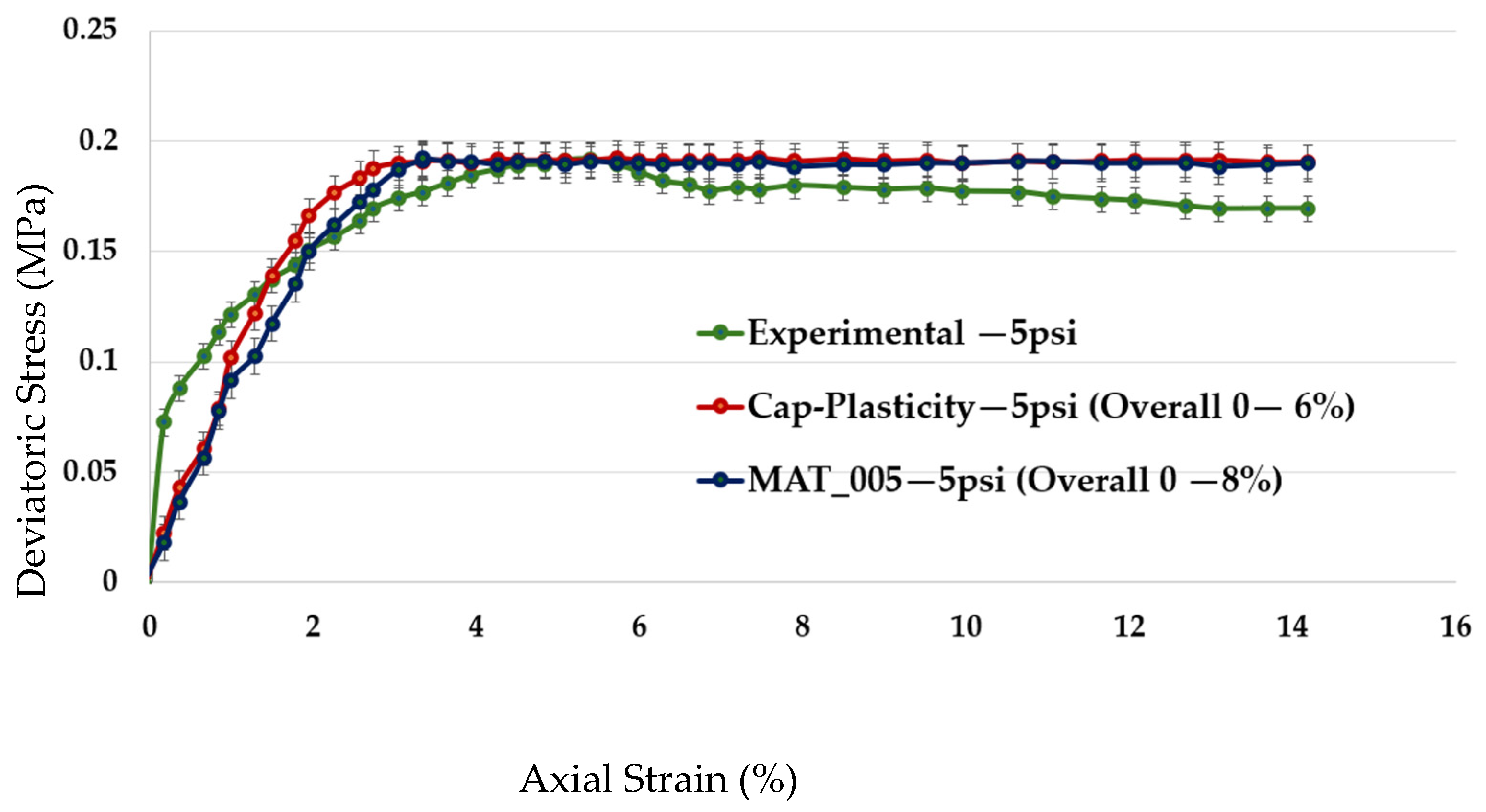 Despite these improvements, the MAT_005 model retains inherent limitations. Its simplified elastic–perfectly plastic yield surface lacks strain hardening and softening mechanisms, limiting its ability to model progressive failure and post-peak softening in real soils under cyclic or repeated loading. This is evident in the triaxial simulations (