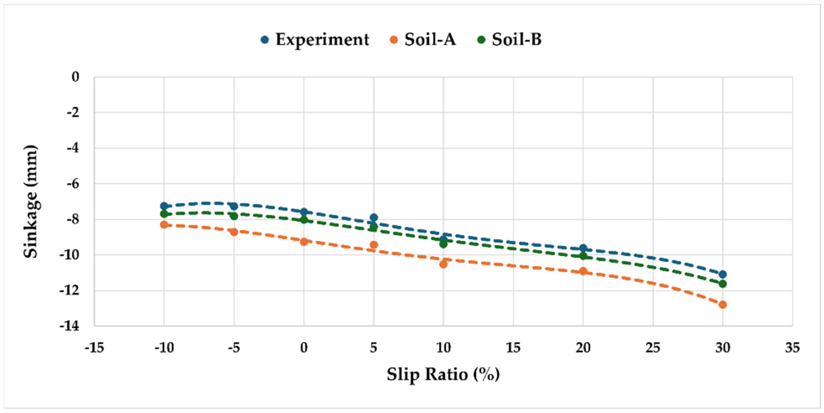 Figure 20. All three datasets Experiment, Soil-A, and Soil-B—capture the initial compaction phase followed by progressive rut deepening as slip increases. The experimental results indicate sinkage increasing from −7.5 mm at −10% slip to −12.5 mm at 30% slip. Soil-A consistently underestimates sinkage, predicting a final depth of −13.5 mm, while Soil-B provides a closer match with −12.5 mm at 30% slip.
