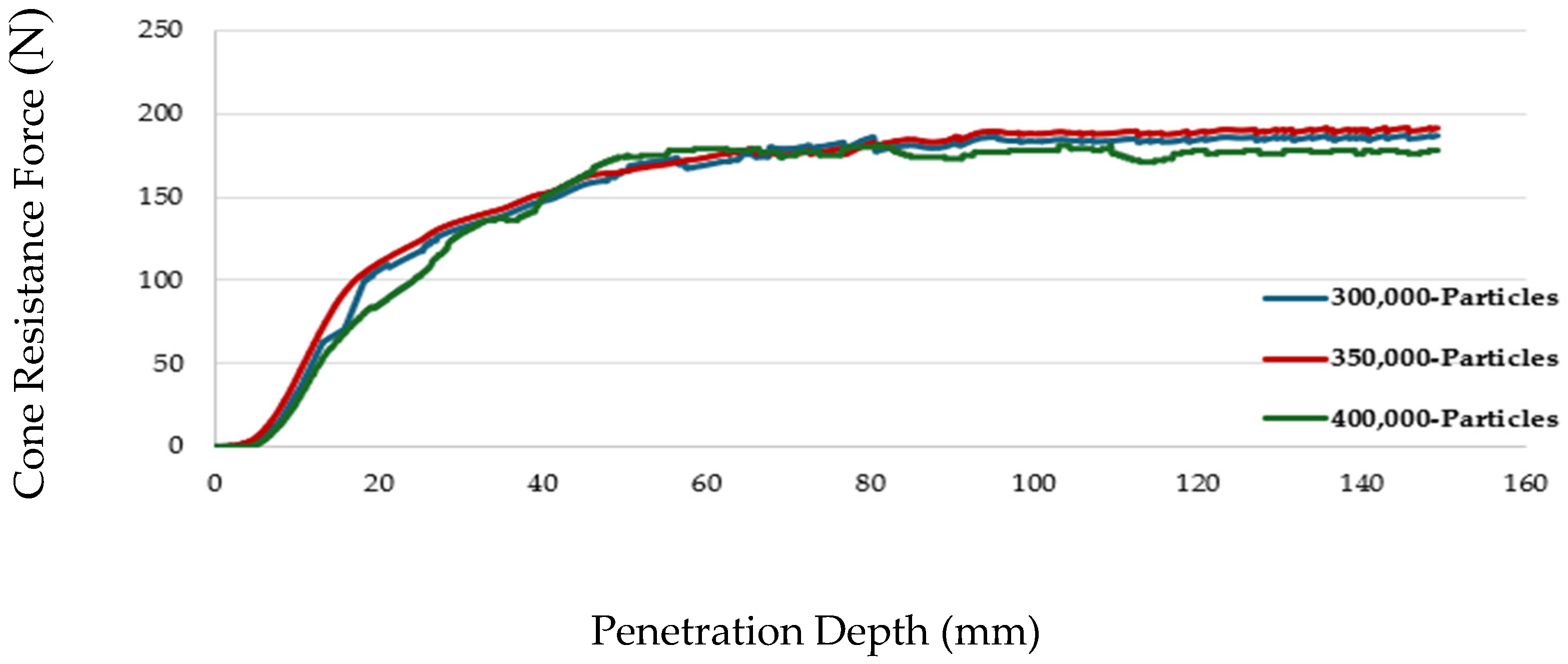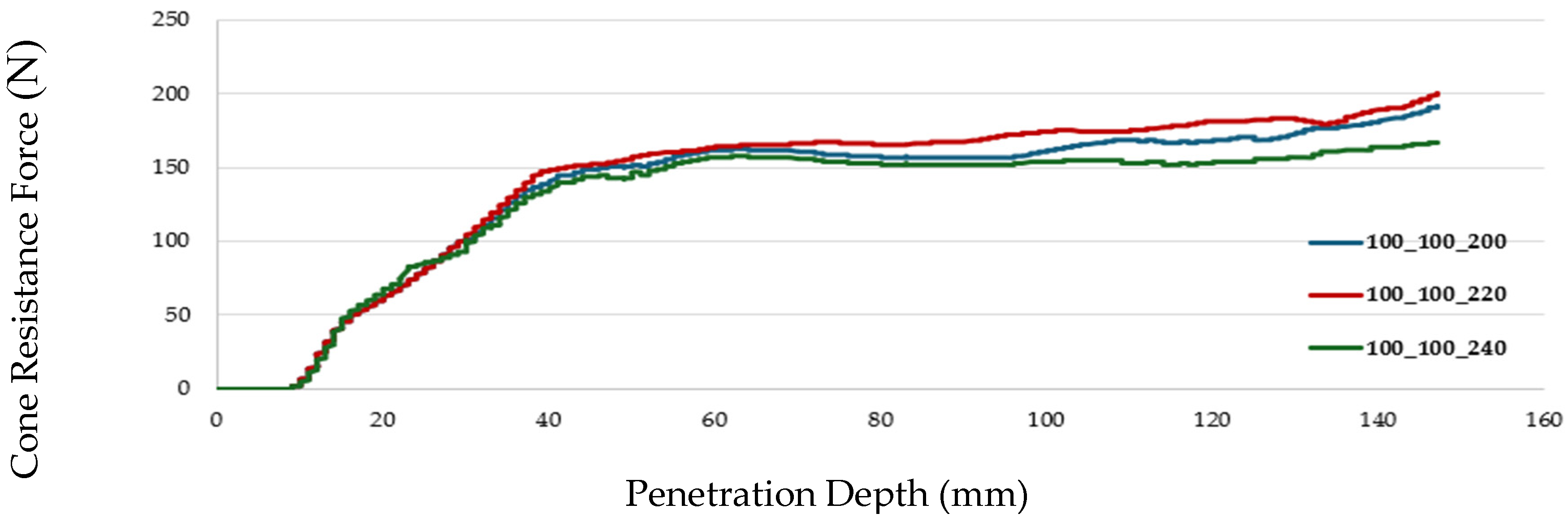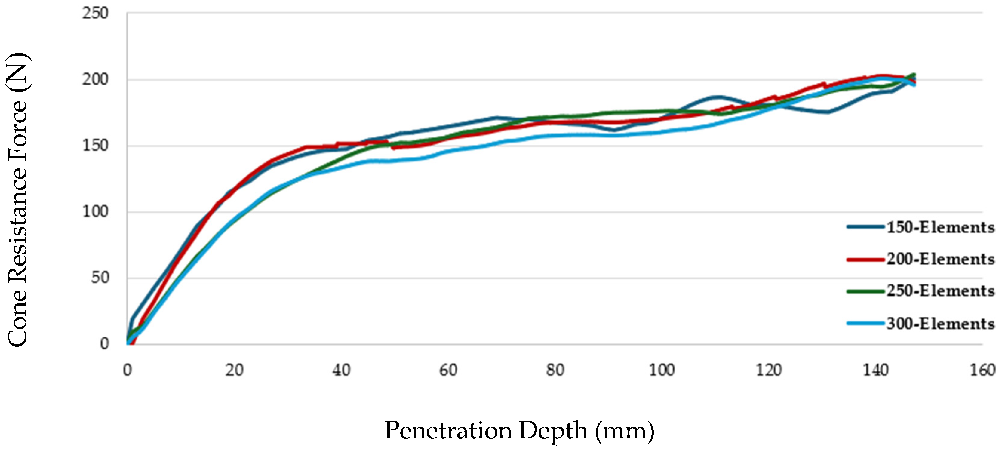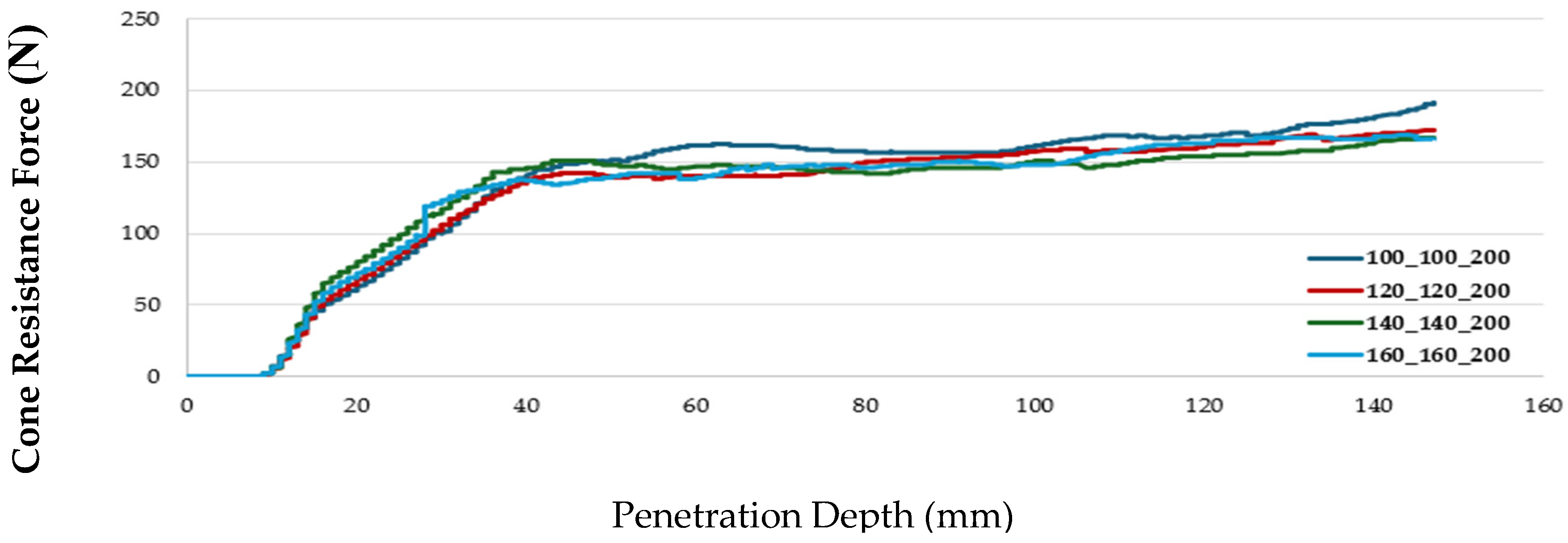 Section 3.2. The optimization results demonstrated a significantly improved fit to the experimental force corridor, with the optimized cone resistance force consistently lying within the corridor across the 150 mm penetration depth. These results validated the sensitivity analysis for sandy loam soil at 0.4% moisture content, accurately reflecting in situ behavior, particularly for granular soils where localized effects drive penetration resistance (