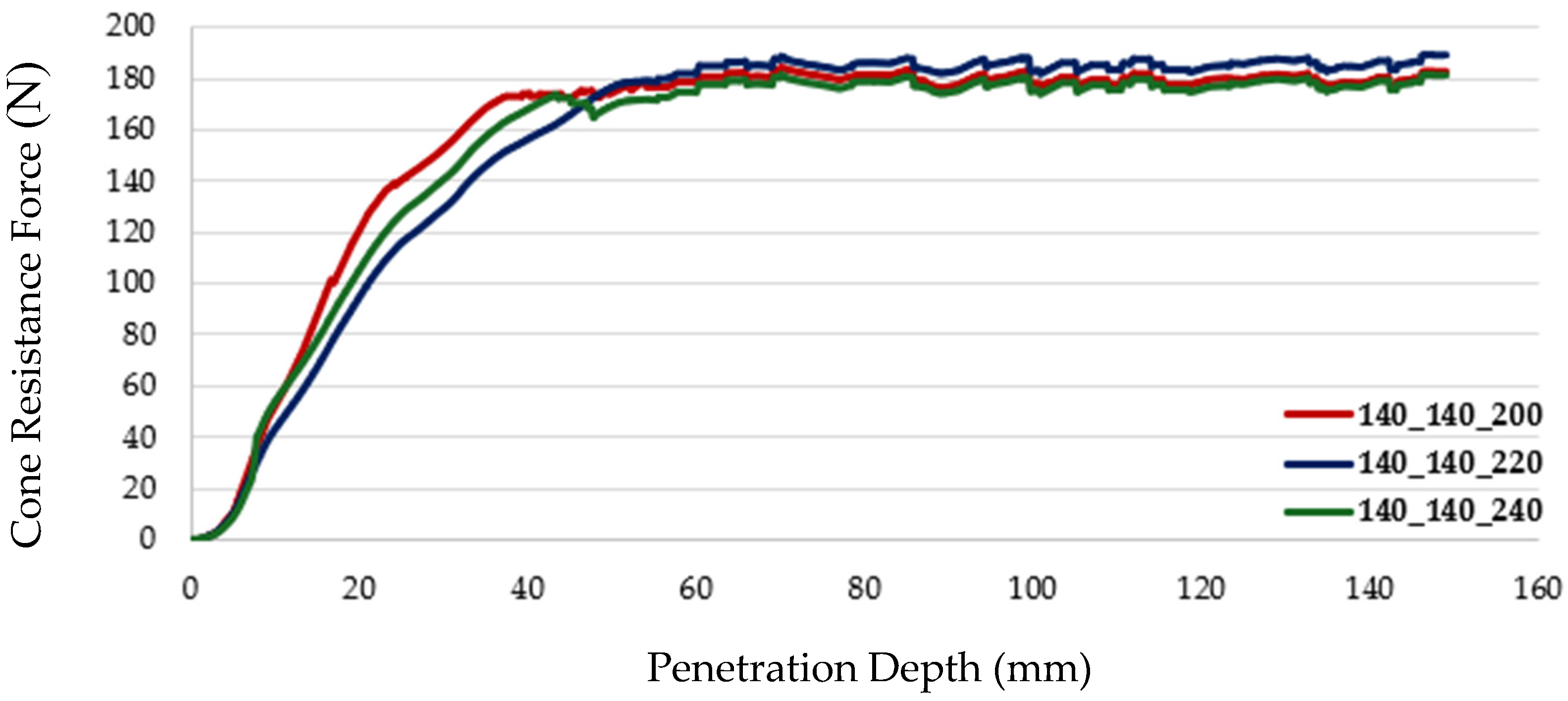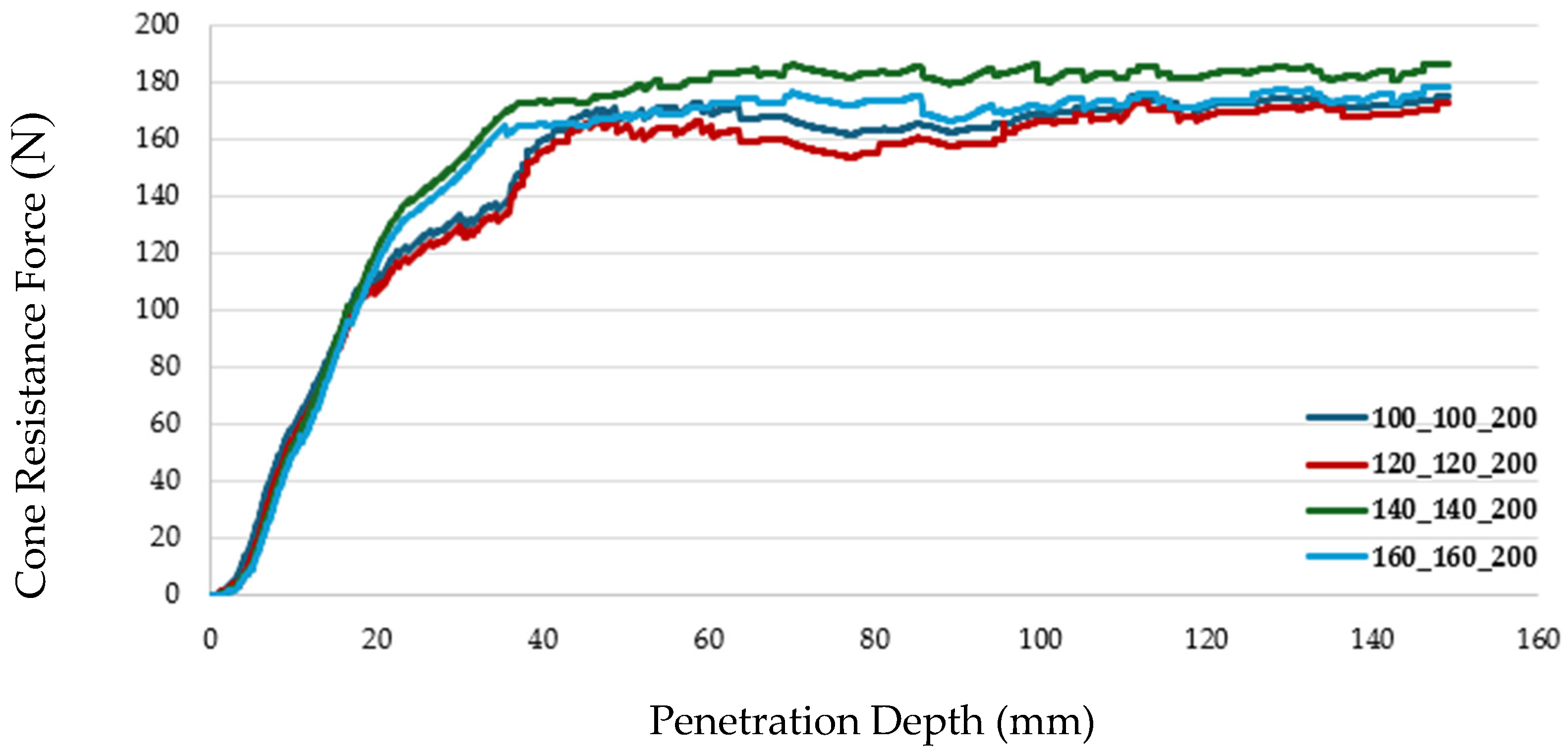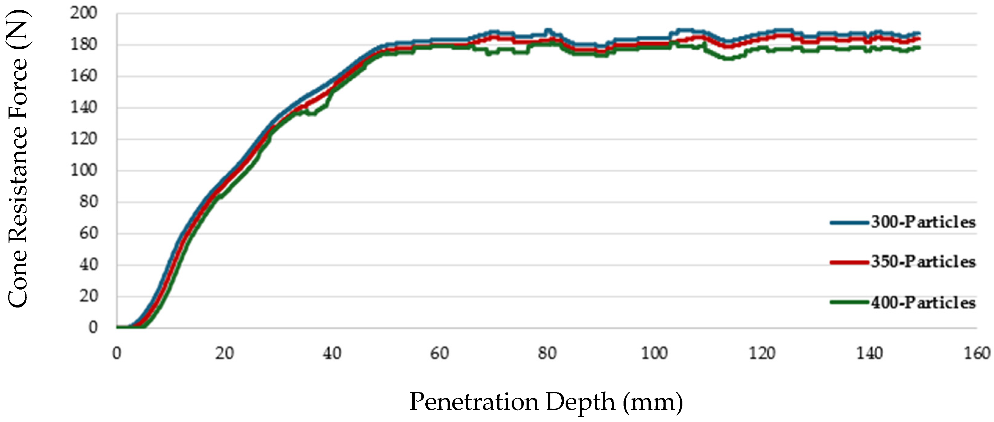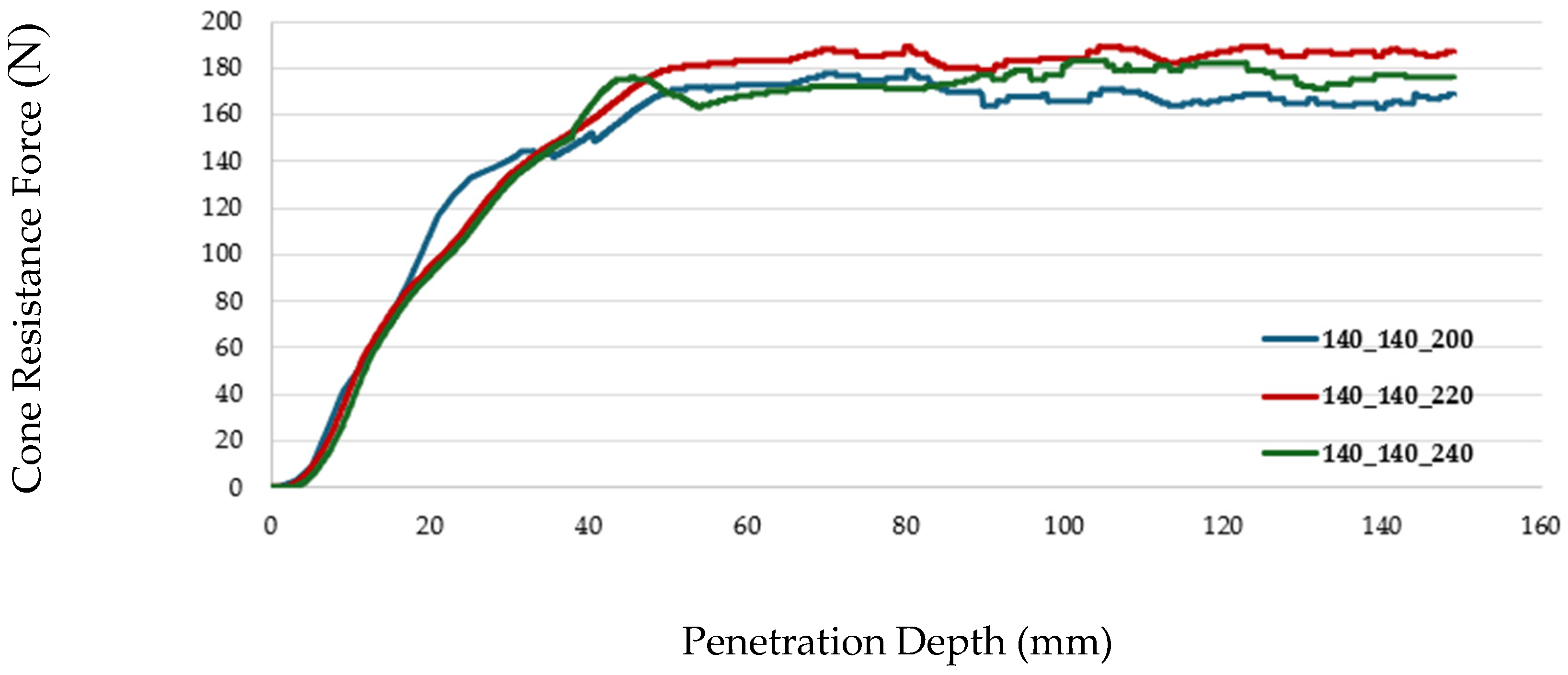 Section 3.2. The optimization results demonstrated a significantly improved fit to the experimental force corridor, with the optimized cone resistance force consistently lying within the corridor across the 150 mm penetration depth. These results validated the sensitivity analysis for sandy loam soil at 0.4% moisture content, accurately reflecting in situ behavior, particularly for granular soils where localized effects drive penetration resistance (