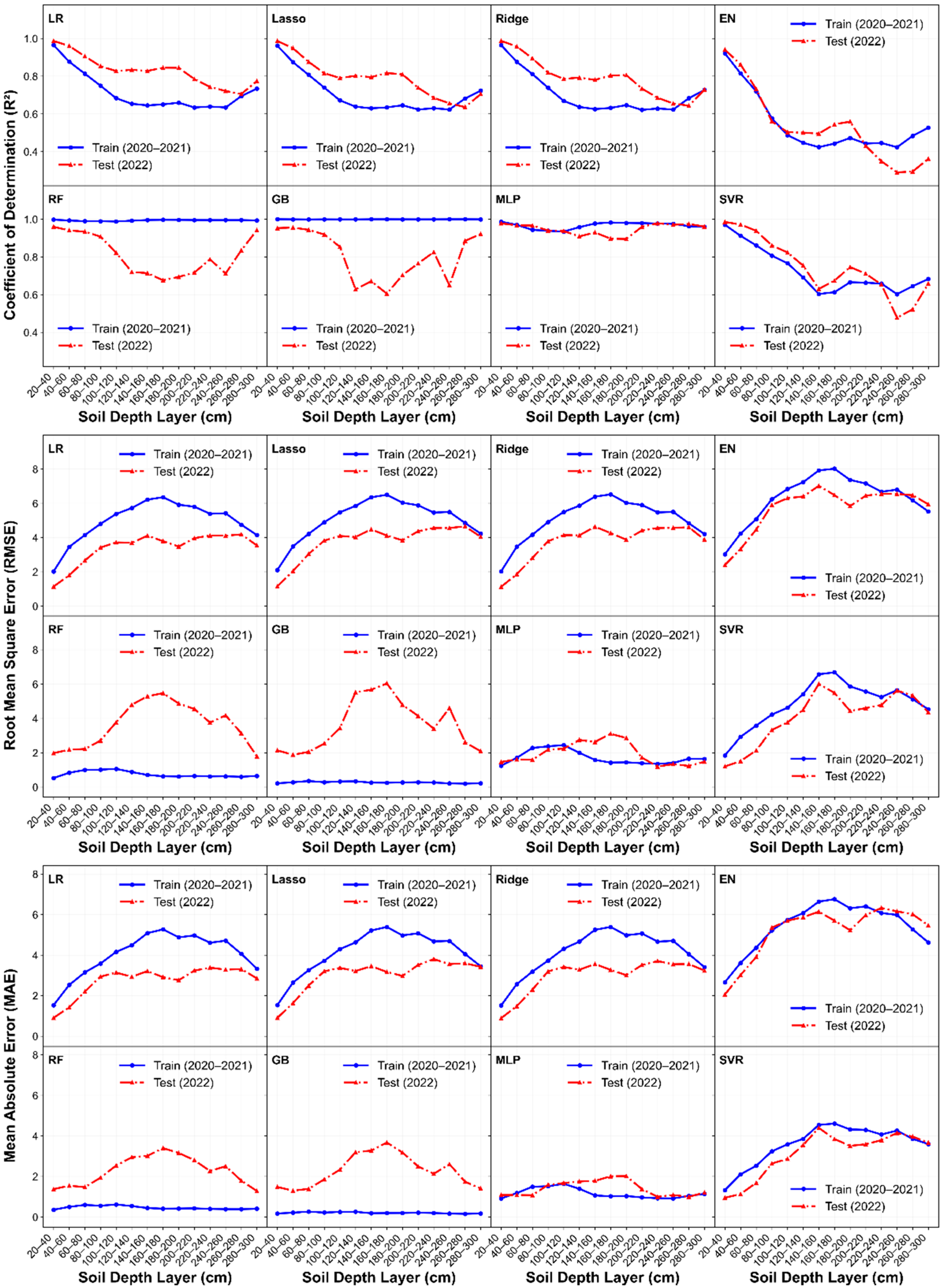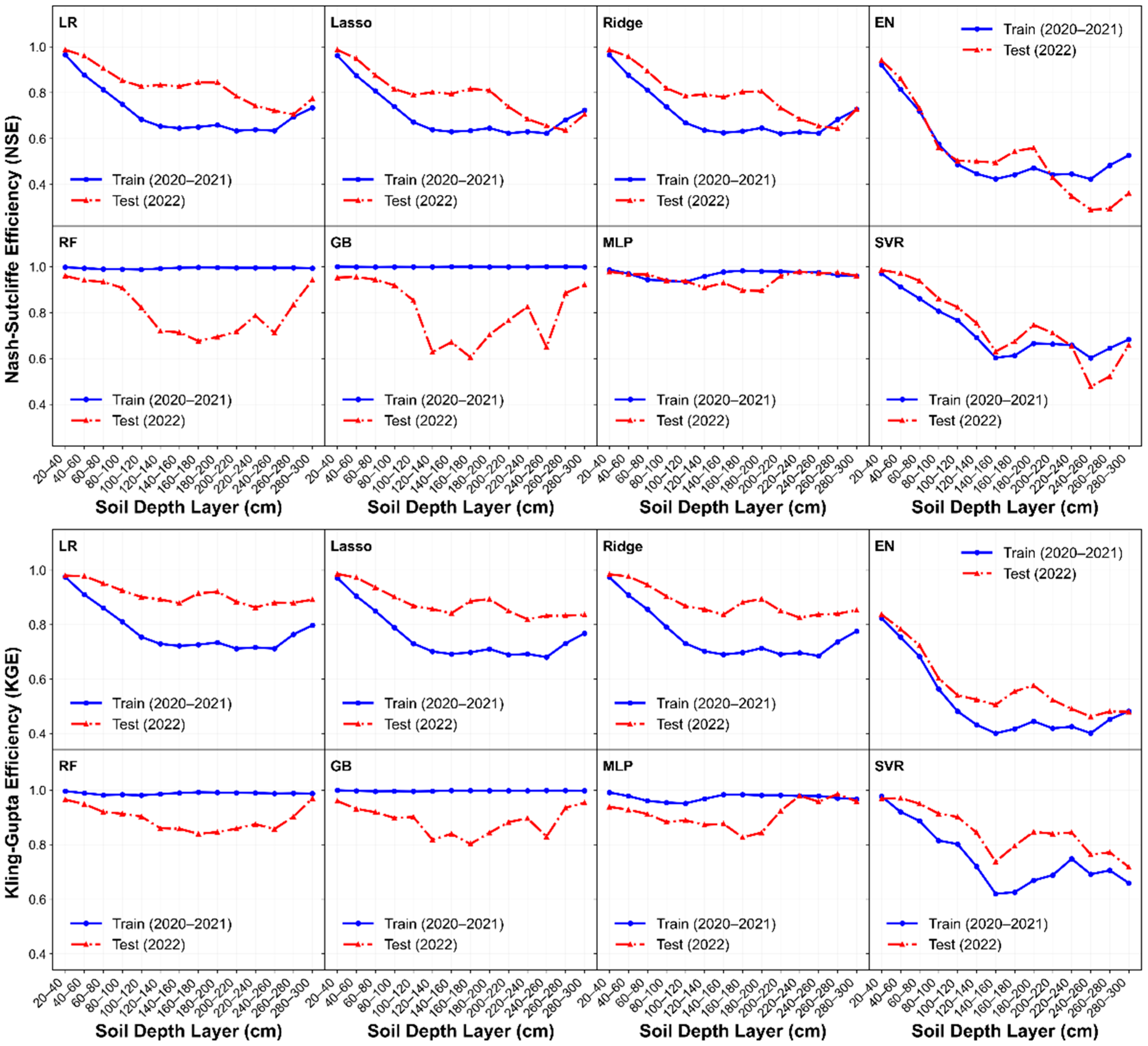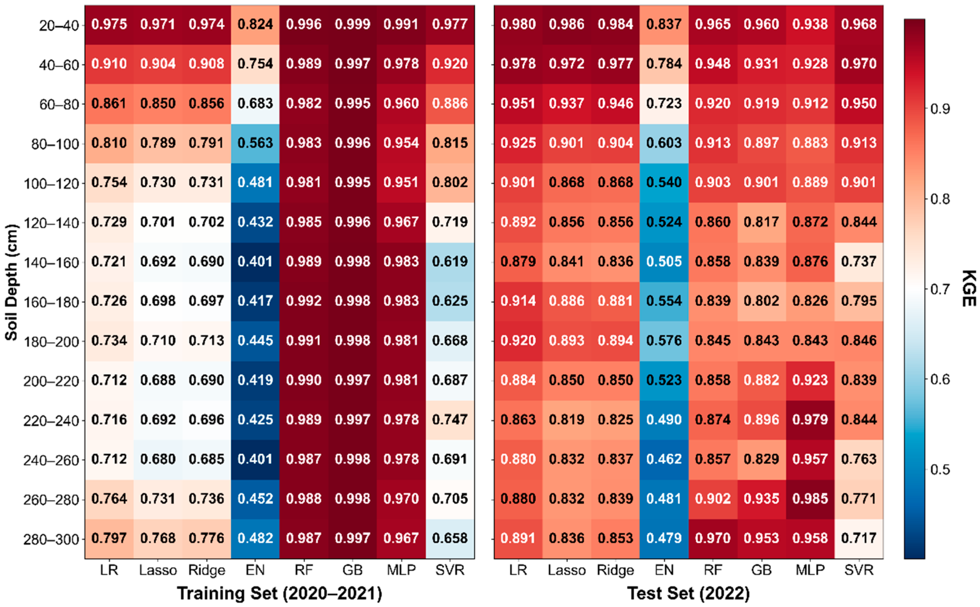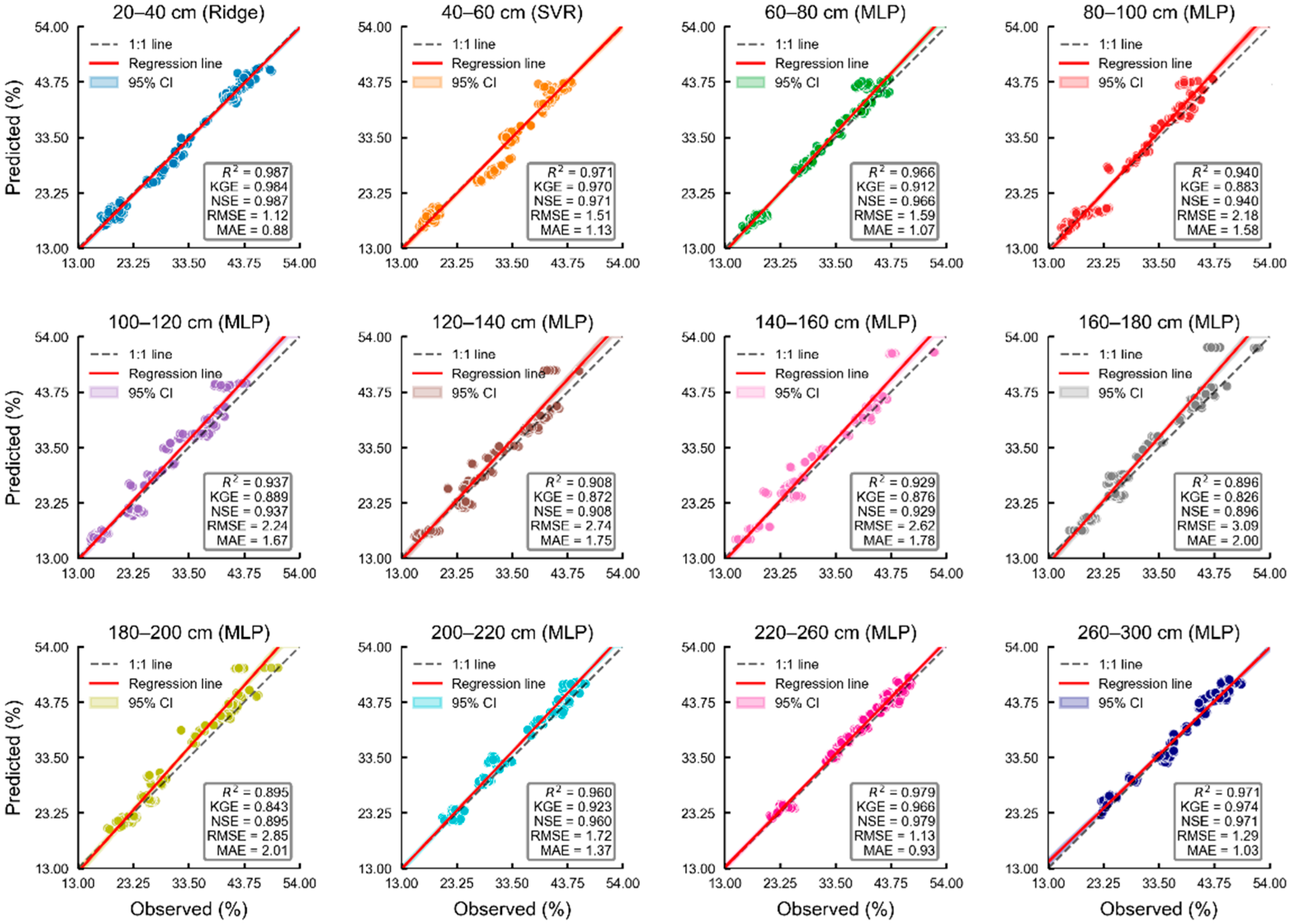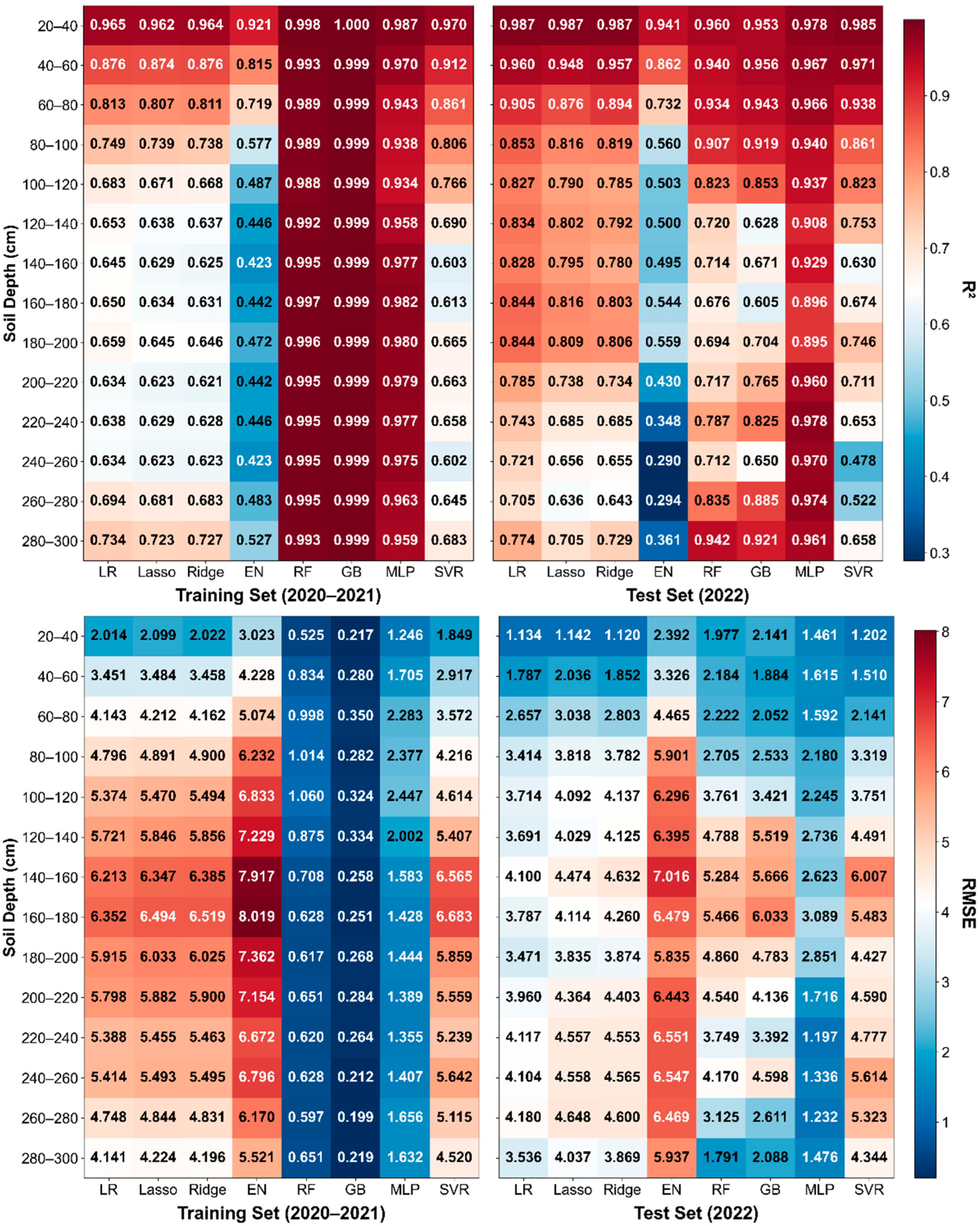 - Machine learning models demonstrated excellent temporal generalization capability in deep soil moisture prediction. Non-linear models achieved R2 of 0.895–0.987 on the 2022 test set across the full profile, making them significantly superior to traditional linear algorithms. Multi-layer perceptron dominated middle and deep layers (60–300 cm), while Ridge Regression performed optimally in 20–40 cm shallow layers (R2 = 0.987), and support vector regression excelled at 40–60 cm (R2 = 0.971).