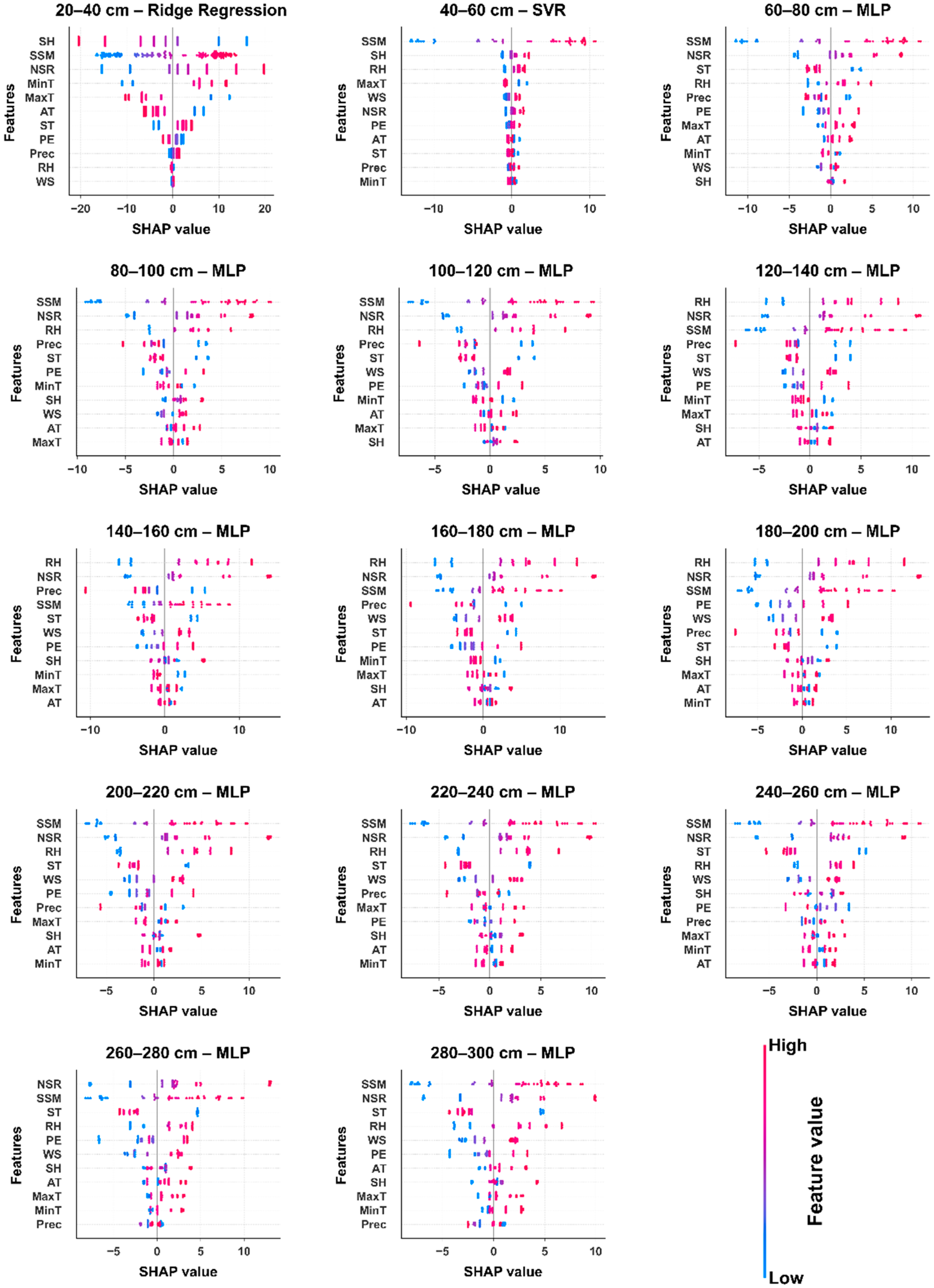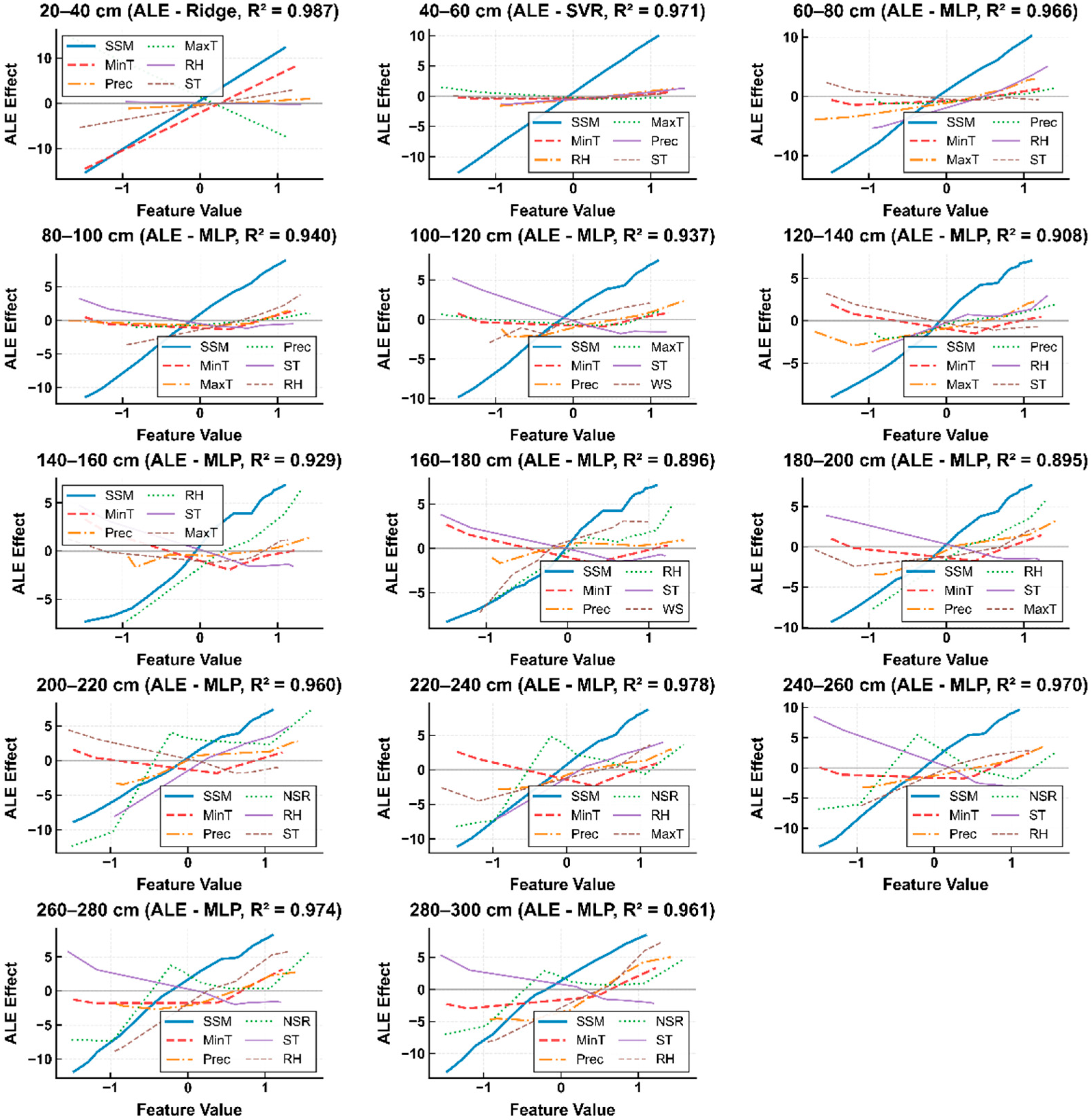 - ALE analysis eliminated feature correlation biases, confirming surface moisture ALEs increased from 8–10 units in shallow layers to 12–18 units in deep layers, validating the “surface-to-deep information transmission amplification” mechanism. Minimum temperature exhibited consistent negative linear effects. Relative humidity at 160–180 cm and 180–200 cm transition zones showed significant positive responses, revealing the high sensitivity of these depth zones as moisture transition layers to atmospheric humidity conditions.