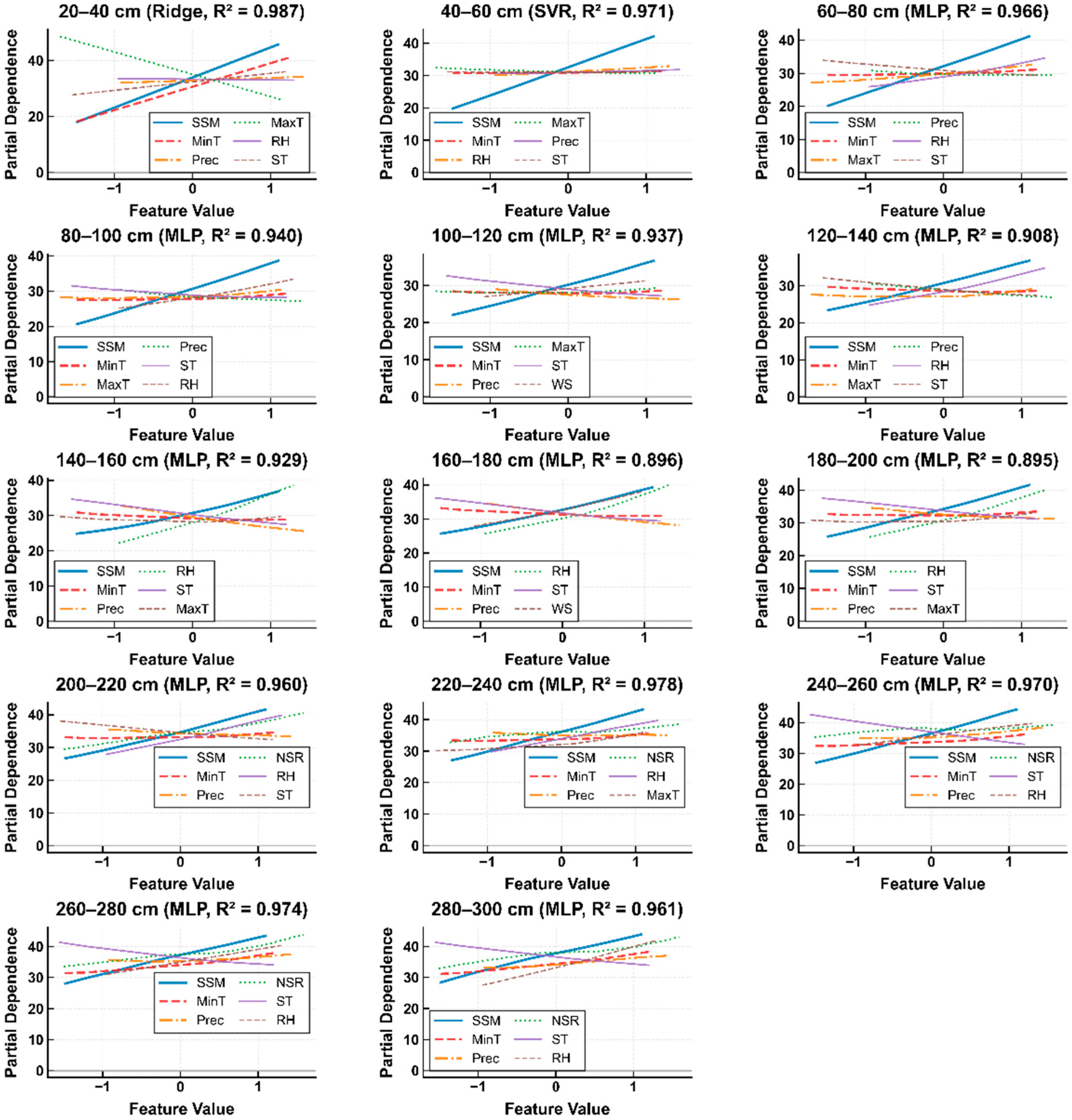 - PDP analysis showed surface moisture exhibited positive linear responses at all depths, with influence intensity progressively strengthening from shallow to deep layers. Minimum temperature maintained consistent negative regulation, while maximum temperature displayed positive upward responses in shallow layers. Precipitation showed gentle positive responses in shallow layers, relative humidity presented relatively stable trends in middle layers (100–200 cm), and net solar radiation exhibited moderate positive slopes in deep layers (200–300 cm).