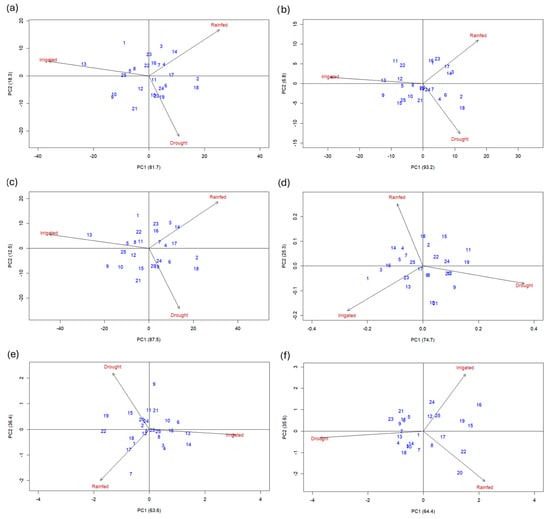 Furthermore, the ideal genotype can be statistically identified as one with a high average yield and a short vector length, indicating high stability across environments []. By correctly interpreting this model, breeders can efficiently identify lines with desirable patterns of interaction, adaptation, and stability, while eliminating materials with low stability or poor performance across environments [,]. For example, Figure 2a visually confirms that line 13, a top performer under irrigation, is positioned in the irrigated sector, while lines 19 and 20, which performed best under drought, are aligned with the drought vector, while lines 11 and 17 seem to be more stable.