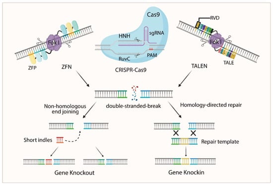 Gene editing is a powerful genetic engineering technique that enables the precise modification of specific gene sequences, enabling gene knockout or knockin. At the core of gene editing technology is the use of engineered nucleases that introduce double-strand breaks (DSBs) at designated genomic loci [10]. These DSBs activate two primary DNA repair pathways in the cell: homology-directed repair (HDR) and non-homologous end joining (NHEJ) [11]. Homology-directed repair is a template-dependent repair mechanism that primarily occurs during the mitotic phase of the cell cycle, using exogenous DNA templates with homologous arms to accurately repair or replace the damaged region [12]. This enables precise gene insertion or point mutation correction. In contrast, NHEJ is a template-independent mechanism that repairs without a template, often introducing indels, which can disrupt gene function and thus achieve gene knockout [13]. Classical gene editing platforms such as zinc-finger nucleases (ZFNs), transcription activator-like effector nucleases (TALENs), and the CRISPR/Cas9 system rely on the induction of DSBs to facilitate gene modification. However, the generation of DSBs can lead to unintended genomic alterations and cellular toxicity. To overcome these limitations, novel systems such as base editors (BEs) and prime editors (PEs) have been developed based on the CRISPR/Cas9 platform (Figure 1). These technologies utilize single-strand breaks instead of DSBs, significantly reducing cytotoxicity and off-target effects [14,15], thereby representing a safer and more promising direction for the future development of gene editing.