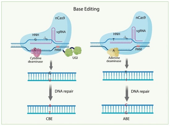 Base editing enables the direct, irreversible conversion of one DNA base to another without DSBs or HDR. It comprises two main types: cytosine base editing (CBE) and adenine base editing (ABE) (Figure 3). CBE is achieved by fusing a cytidine deaminase (e.g., rat APOBEC1) to a Cas9 nickase (nCas9) and an uracil DNA glycosylase inhibitor (UGI). Guided by sgRNA, the complex targets a specific DNA region, where cytosine is deaminated to uracil. UGI inhibits uracil DNA glycosylase (UDG) from excising uracil, allowing it to be interpreted as thymine during DNA replication or repair, resulting in a C to T substitution [65,66]. ABE follows a similar principle, using an engineered adenine deaminase fused to nCas9. At the target site, the adenine deaminase converts T to inosine (I), I is recognized as G, and through DNA repair, I is ultimately converted to G [67,68,69]. While BEs are well-suited for precise point mutation editing, they are limited in their ability to mediate insertions or deletions, motivating the development of prime editing technology.