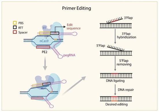 The PE system comprises a fusion protein (PE2) consisting of nCas9 and reverse transcriptase, along with a prime editing guide RNA (pegRNA). The pegRNA is an extended sgRNA containing a primer binding site (PBS) and a reverse transcription template (RTT) at its 3′ end. Upon recognition of the target site by pegRNA, nCas9 induces a nick in the non-target DNA strand, which then hybridizes with the PBS region of the pegRNA. Reverse transcriptase uses the RTT sequence to synthesize a DNA strand encoding the desired edit. This forms a 3′ DNA flap, which replaces the original sequence through flap resolution and DNA repair. The edited strand is then used as a template to correct the opposite strand, achieving precise, bidirectional editing without inducing DSBs [15,70,71].