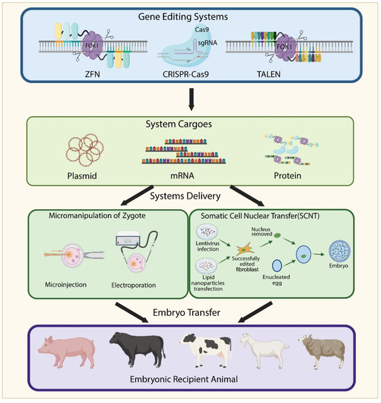 To overcome these limitations, alternative strategies have been explored. Sperm-mediated gene transfer (SMGT) allows edited spermatozoa to fertilize oocytes, thereby delivering genetic modifications into the embryo. Testis-mediated gene transfer (TMGT) introduces exogenous DNA or gene-editing components directly into the testis using viral or non-viral vectors for in vivo genome editing. Additionally, spermatogonial stem cells can be isolated, genetically modified ex vivo, and then transplanted back into the testis to produce gene-edited spermatozoa [181,182]. Moradbeigi, P et al. transfected mouse sperm with a CRISPR/Cas9 system targeting the Gdf8 gene, and after in vitro fertilization and embryo transfer, they finally obtained a chimeric mouse [183]. Konoval, O et al. transfected duck sperm with the CRISPR/Cas9 system and a GFP gene sequence, and after artificial insemination, obtained 19 F1 offspring carrying the GFP gene [184]. Similarly, Cooper, C.A et al. used this method to generate chickens with a DFP gene knockout [185]. The cost and operational complexity of these two techniques are lower than those of the earlier methods. These emerging techniques offer the potential for more efficient and less invasive generation of gene-edited livestock.