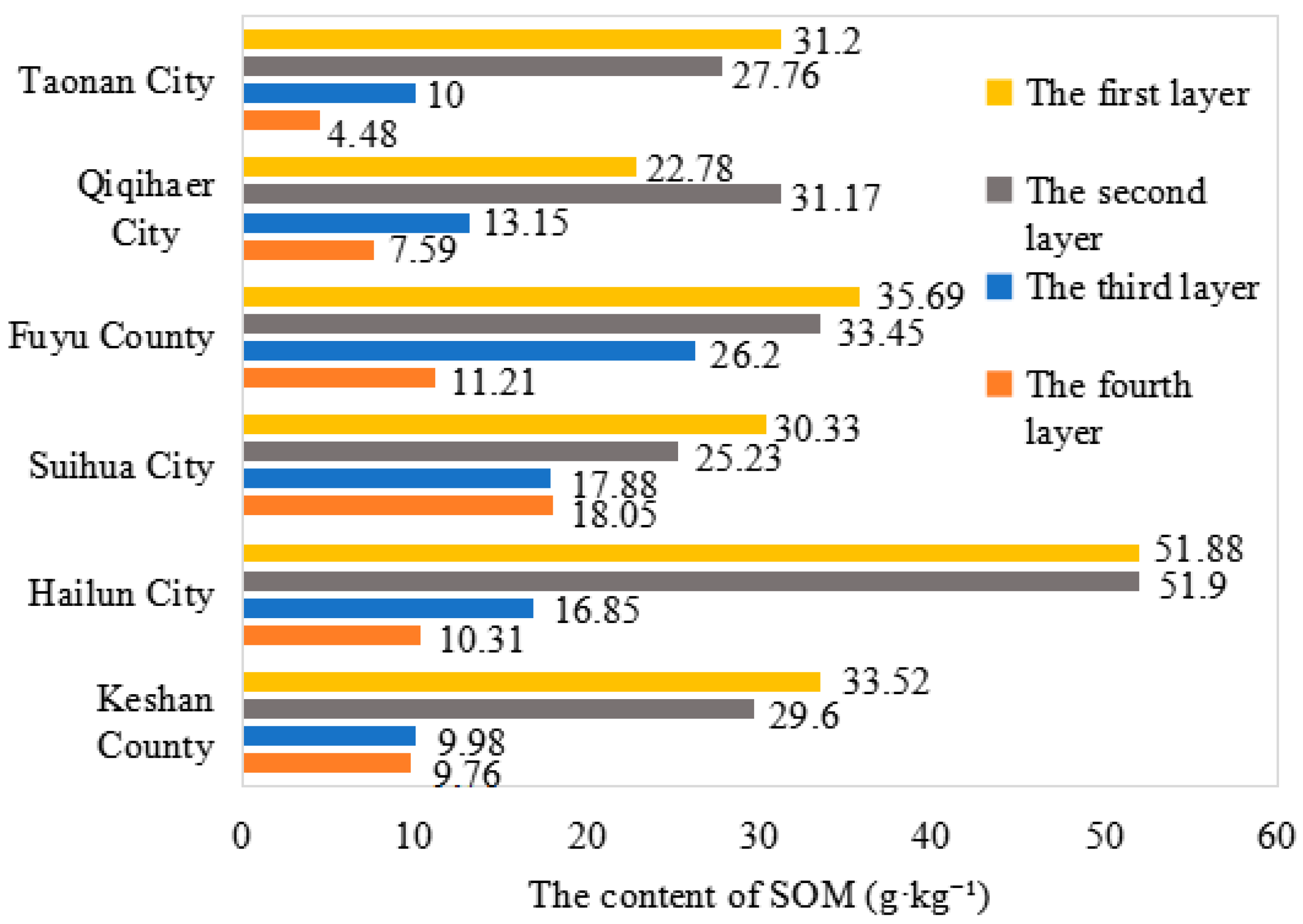 3.2. Characteristics of Changes in SOM Content in the Songnen Plain