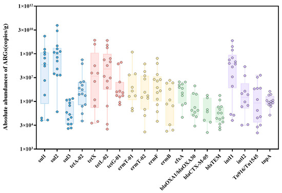 Samples were collected from 21 organic fertilizer factories across 5 counties and cities from 23 March to 19 July 2023. Sterile spatulas were used to collect the organic fertilizer samples into sterile bags, resulting in a total of 21 samples, which were then stored at −20 °C. Detailed information on these 21 samples is provided in Table S1. DNA was extracted from the samples. Fifteen ARGs associated with sulfonamides, tetracyclines, macrolides, and β-lactams, which were identified as having higher residual levels during the composting maturity phase in prior studies, were selected for absolute quantitative analysis.