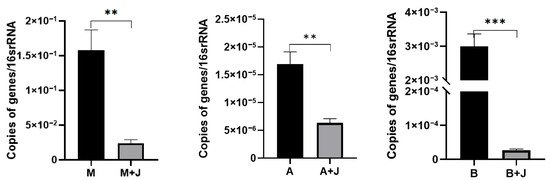 Effects of compound microbial inoculant on sul1 gene expression in bacterial strains M, A, and B. ‘M’ represents a group of the model bacteria; ‘A’ denotes a group of Bacillus pseudomycoides; ‘B’ indicates a group of Alcaligenes faecalis. The black bars indicate the basal expression levels of the sul1 gene, while the gray bars show the expression levels post-treatment with the compound microbial inoculant ‘J’. Statistical significance of differences in gene expression relative to the control is denoted by asterisks (** p < 0.01, *** p < 0.001).