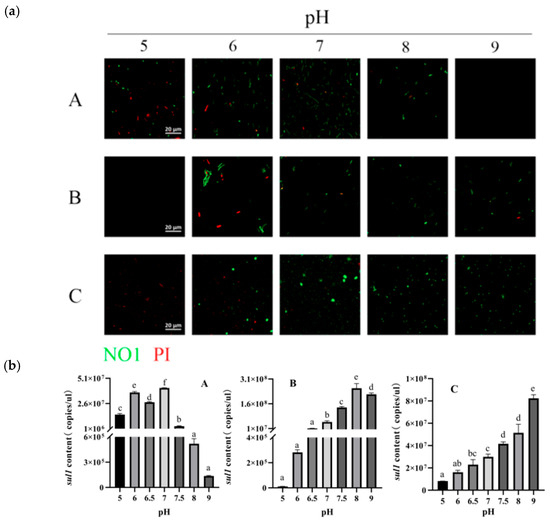 The effect of pH on the sul1 model bacterium, Bacillus pseudomycoides and Alcaligenes faecalis content of sul1. (a): Representative immunofluorescence images (×20) of live (green) and dead (red) bacteria following culture under different pH conditions. Panels A, B, and C show the sul1 model bacterium, Bacillus pseudomycoides, and Blcaligenes faecalis, respectively. (b): Absolute sul1 content in each group. Significant differences between groups are indicated by different lowercase letters. Panels A, B, and C show the sul1 model bacterium, Bacillus pseudomycoides, and Blcaligenes faecalis, respectively.