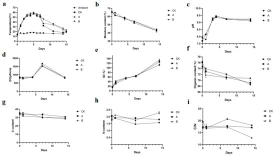 Physicochemical changes during pig manure composting. The parameters measured include (a) temperature, (b) moisture content, (c) pH, (d) electrical conductivity (EC), (e) germination index (GI), (f) organic matter content, (g) carbon (C), (h) nitrogen (N), and (i) carbon-to-nitrogen ratio (C/N). ‘CK’ denotes the control composting process with pig manure, ‘A’ represents the addition of 2% compound microbial agents once, and ‘B’ indicates repeated additions of 2% compound microbial agents.