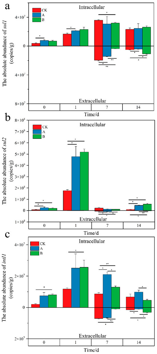 Changes in absolute abundance of intracellular and extracellular sul1 (a), sul2 (b), intI1 (c) genes during composting. Above the 0 scale are intracellular genes, below the 0 scale are extracellular genes. CK represents the control group (no microbial agent added); A represents the single inoculation group (agent added at the start of composting); and B represents the repeated inoculation group (agent added at the start and again on the eighth day of composting). Statistical significance between treatments and the control group at each time point is denoted by asterisks (* p < 0.05, ** p < 0.01).