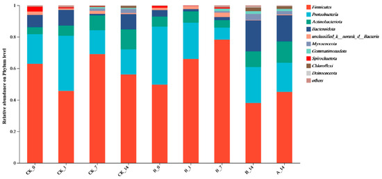 Structure and abundance of flora at the phylum and genus level. ‘CK’ denotes the control composting process with pig manure, ‘A’ represents the addition of 2% compound microbial inoculant once, and ‘B’ indicates repeated additions of 2% compound microbial inoculant. The number corresponds to a sampling point during the composting timeline: ‘0’ (initial phase), ‘1’ (thermophilic phase), ‘7’ (high-temperature phase), and ‘14’ (maturation phase).