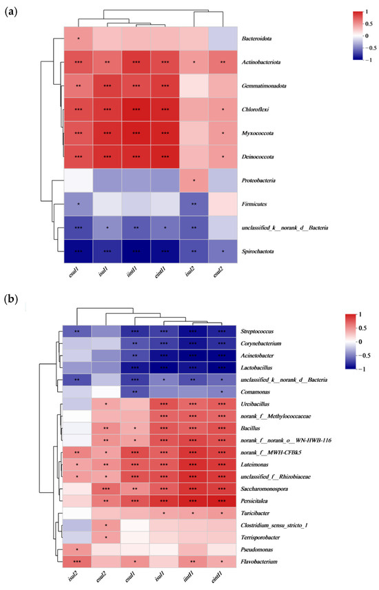 Phylum-level correlation analysis revealed that Actinobacteria showed a significant positive correlation with both intracellular and extracellular sulfonamide ARGs and the intI1 gene, while Spirochaetota exhibited a negative correlation (Figure 7a). At the genus level, during the maturation phase, significant increases were observed in the abundance of genera such as Ureibacillus, Bacillus, Luteimonas, Saccharomonospora, and Persicitalea, among others, which showed a positive correlation with sulfonamide ARGs and the intI1 gene. These microbial groups could be potential hosts for sulfonamide ARGs and the intI1 gene, with their abundance reduced after the addition of microbial preparations. Genera such as Streptococcus, Corynebacterium, Acinetobacter, and Lactobacillus exhibited a significant negative correlation with intracellular and extracellular sul1 and the intI1 gene, and their abundance was also reduced in the later stages (Figure 7b). Intracellular sul2 (isul2) showed a significant negative correlation with Streptococcus and so on.