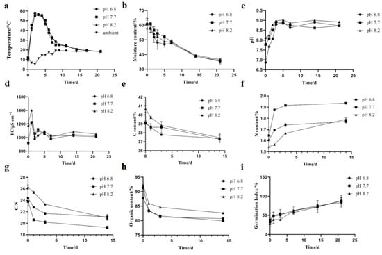 Physicochemical changes during pig manure composting. The parameters measured include (a) Temperature, (b) Moisture content, (c) pH, (d) EC, (e) TC (f) TN, (g) C/N, (h) Organic content, (i) GI.