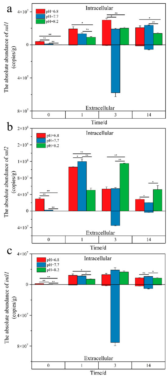 Temporal changes in absolute abundance of intracellular and extracellular sul1 (a), sul2 (b), intI1 (c) Genes during composting. Values above the zero line on the y-axis indicate intracellular gene abundance, while values below represent extracellular abundance. The time points on the x-axis (0, 1, 3, and 14 days) correspond to the initial, thermophilic, high-temperature, and maturation phases of composting, respectively. Statistical significance is indicated by asterisks directly above the bars, with * p < 0.05, and ** p < 0.01.