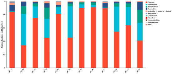 In the compound microbial inoculant addition group, samples from the initial, warming, peak temperature, and maturation phases were selected across two categories, CK and B, totaling nine sets corresponding to days 0, 1, 7, and 14 for 16S rRNA sequencing. Additionally, twelve sets of samples from varying pH levels within this group during these same phases were chosen, corresponding to days 0, 1, 3, and 14, with each set having three replicates. The 16S rDNA V3-V4 variable regions were amplified using primers 338F (5′-ACTCCTACGGGAGGCAGCAG-3′) and 806R (5′-GGACTACHVGGGTWTCTAAT-3′). Libraries were prepared using the NEXTFLEX Rapid DNA-Seq Kit (Bioo Scientific, Austin, TX, USA) and sequenced on the Illumina MiseqPE300/NovaSeq PE250 platform (Meiji, Shanghai, China). The library construction and sequencing tasks were outsourced to Shanghai Majorbio Bio-pharm Technology Co., Ltd., Shanghai, China.